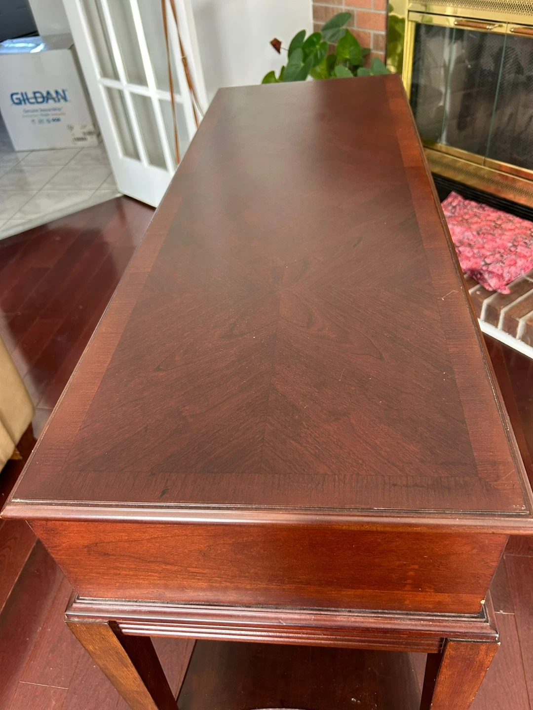 This Bombay Company console table features a rich, dark wood finish with a decorative inlay on the top. It has two drawers with pull knobs and a lower shelf for storage. Made in China. Manufactured in 2010. Perfect for entryways or living spaces!