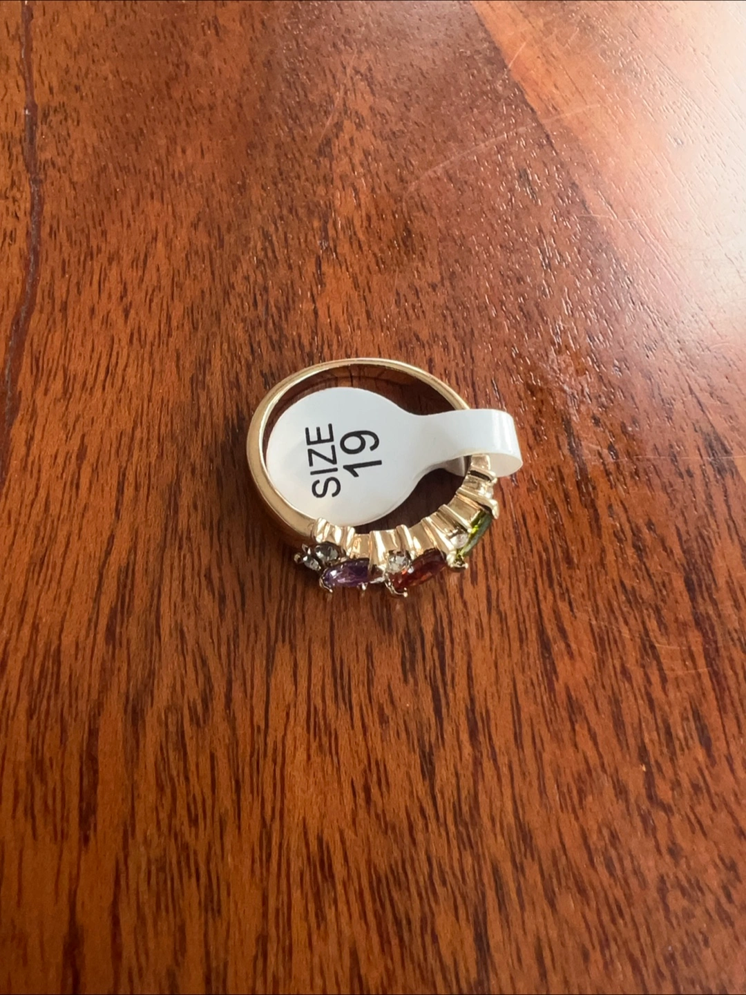 Gold-toned ring. Features various colourful gemstones. Size 19. A ring like this would bring a smile to your face as you go about your day.