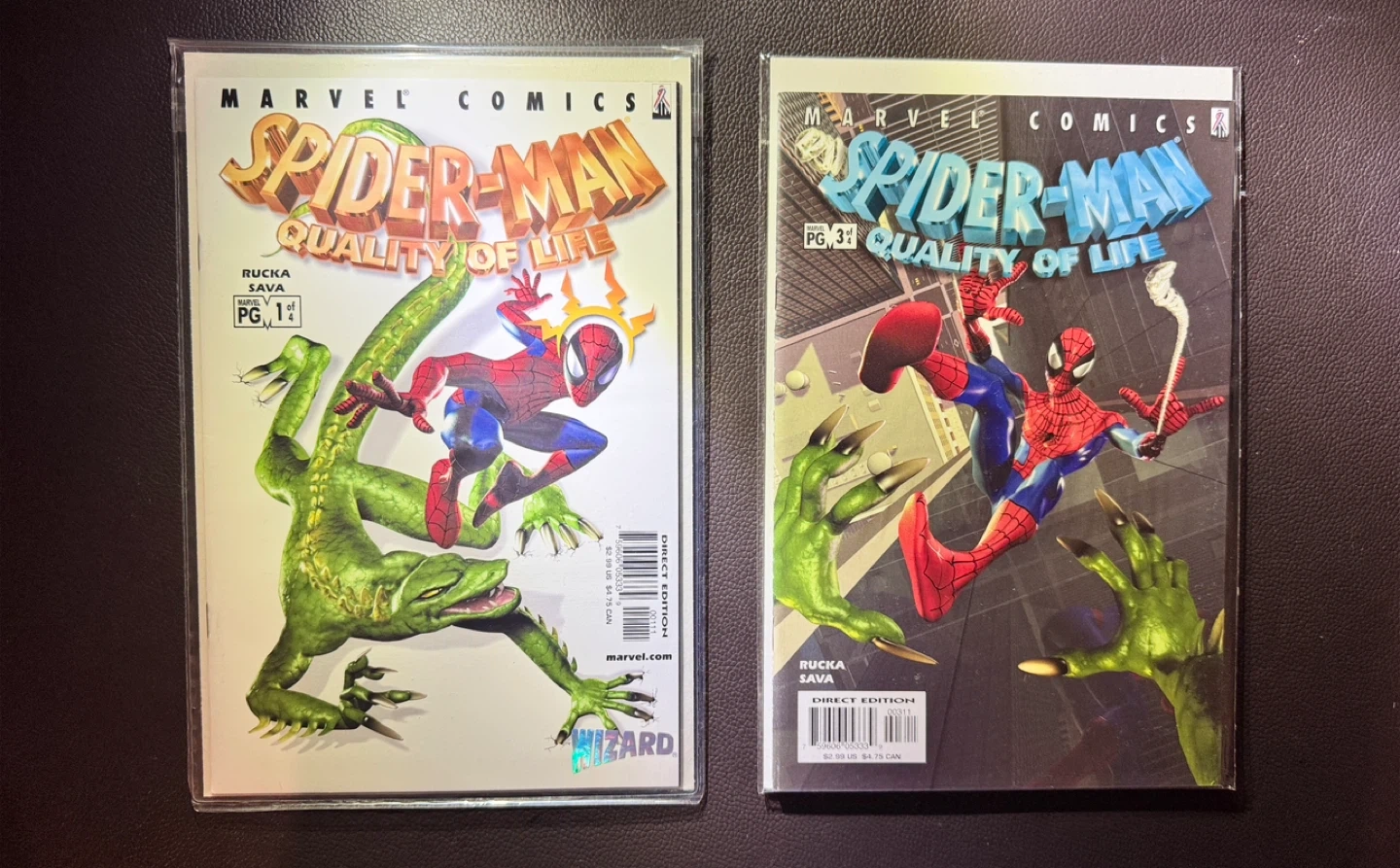 Selling two issues of Marvel Comics Spider-Man: Quality of Life. Features Spider-Man facing off against a lizard-like foe. Written by Rucka and SAVA.