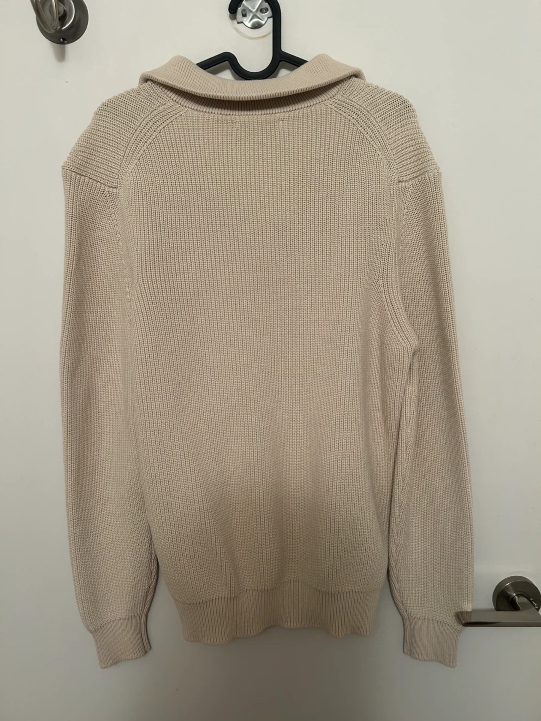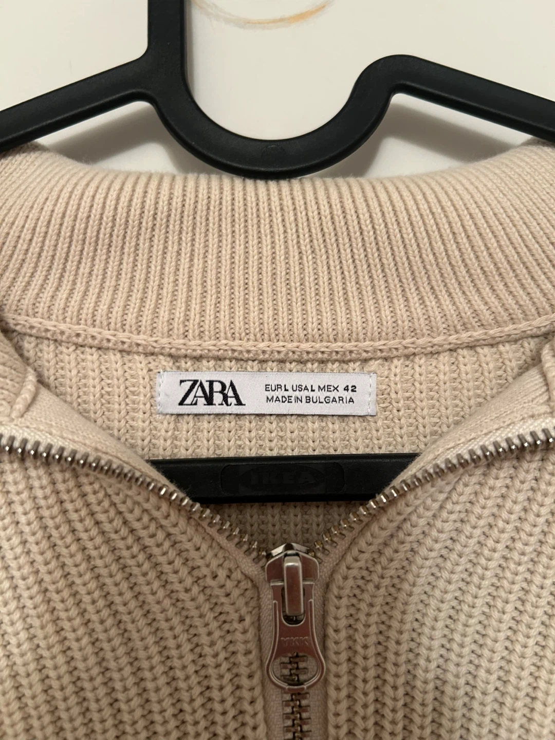 A beige knit sweater from ZARA with a half-zip closure and collar. Made in Bulgaria, size L. Cash preferred. Pick up only.