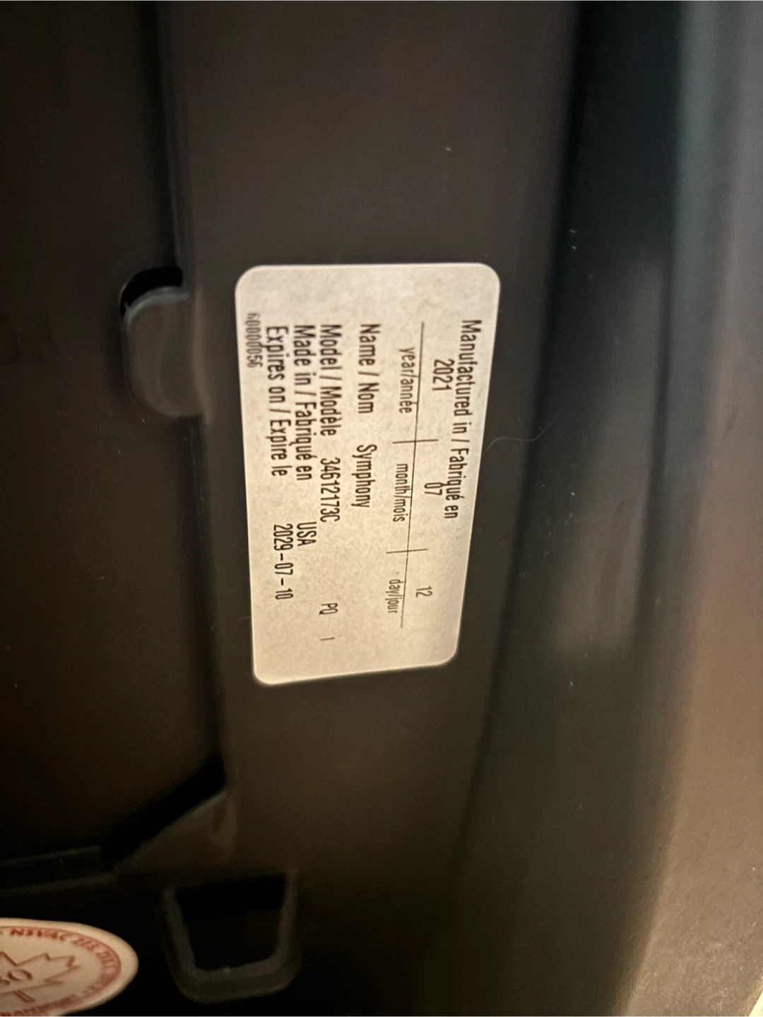 Evenflo Symphony all-in-one car seat. Suitable for children from 5 to 110 lbs. It's designed for rear-facing, forward-facing, and belt-positioning booster modes. The car seat has adjustable harness positions for a custom fit. Purchased in 2021.