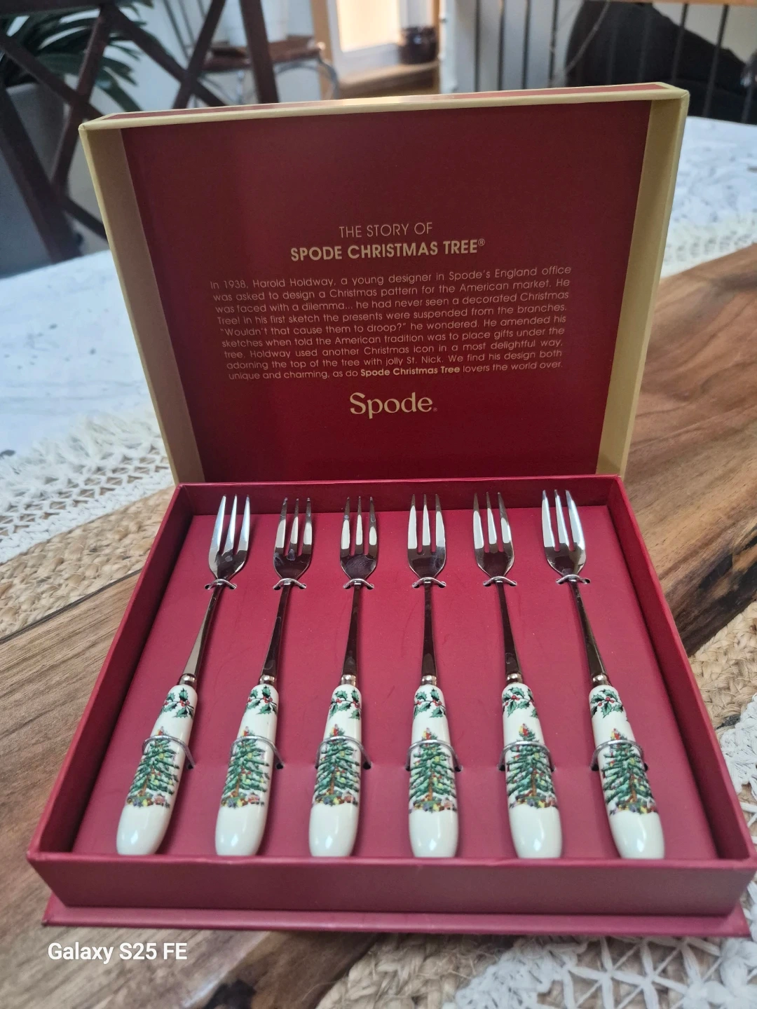 This is a set of 6 dessert forks from Spode featuring their classic Christmas Tree design. The handles have a cream base adorned with a festive Christmas tree and holly motif. They come in their original box, ready for holiday entertaining!