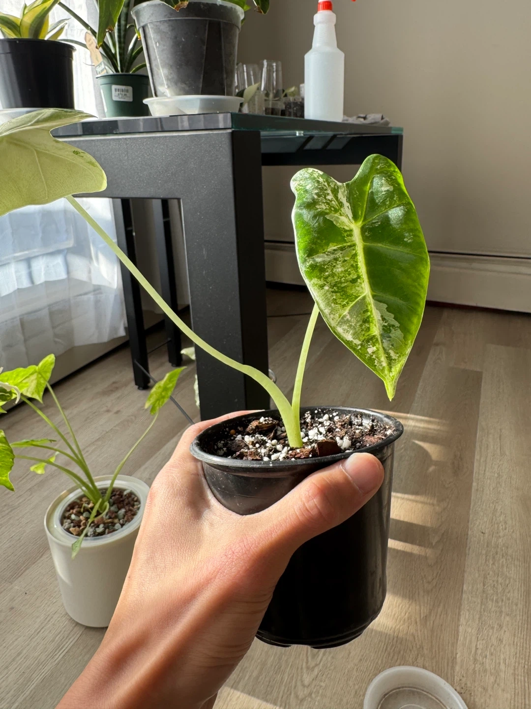 This is a variegated Alocasia Frydek plant. It's potted in a black nursery pot. This plant has distinctively patterned leaves, showcasing a mix of green and creamy white variegation.