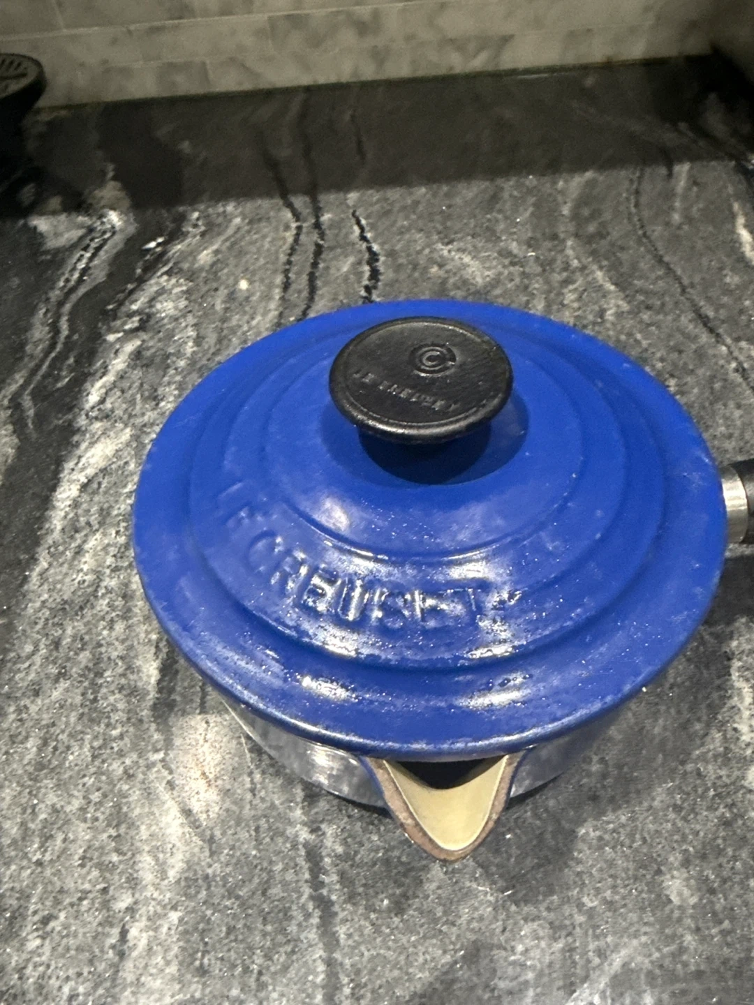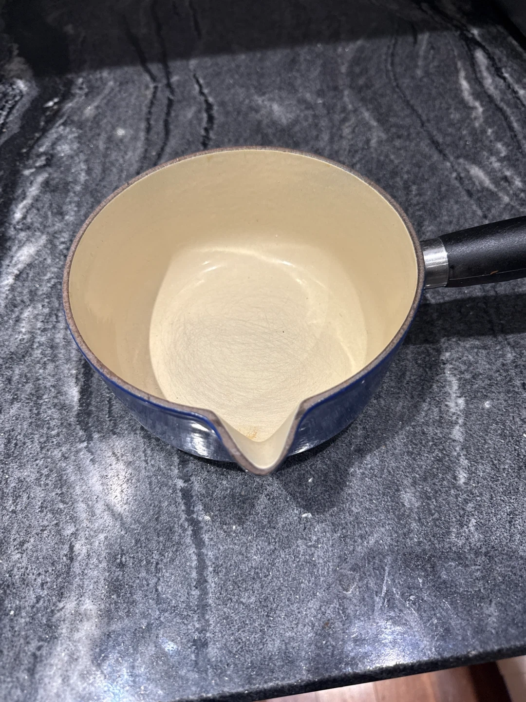 This is a Le Creuset enameled cast iron saucepan. It's a vibrant blue colour with a cream interior. It features a pouring spout and a black handle. It's great for making sauces or small batches of food!