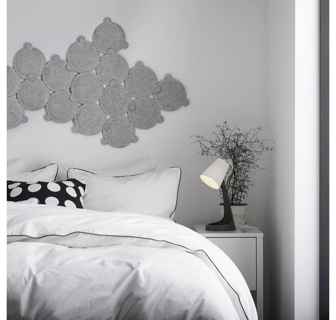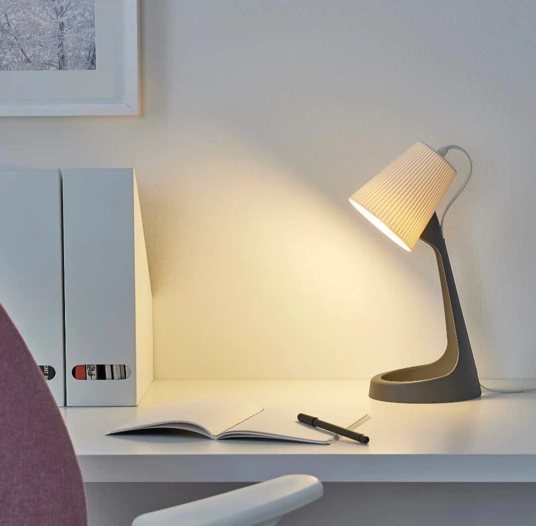 This IKEA FADO table lamp provides a warm, ambient glow. It features a textured white lampshade and a dark grey base. It's perfect for adding a cozy light to your bedside table or desk.