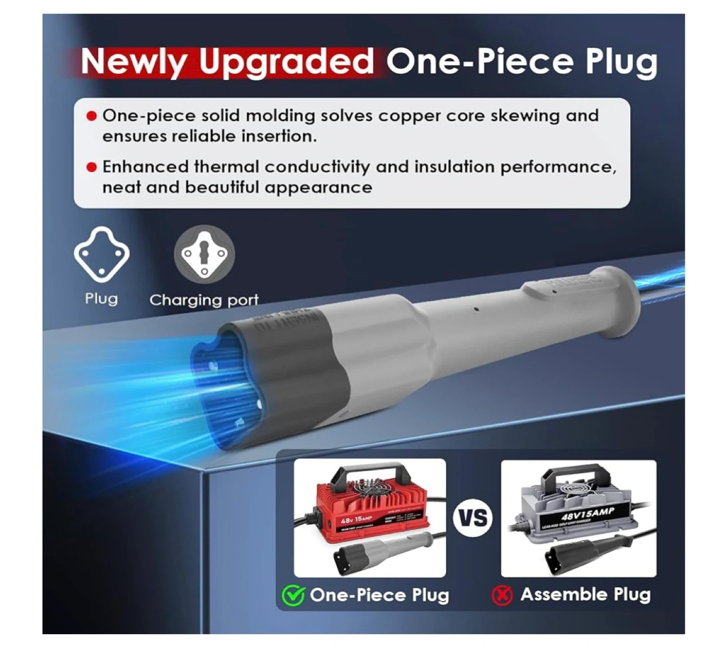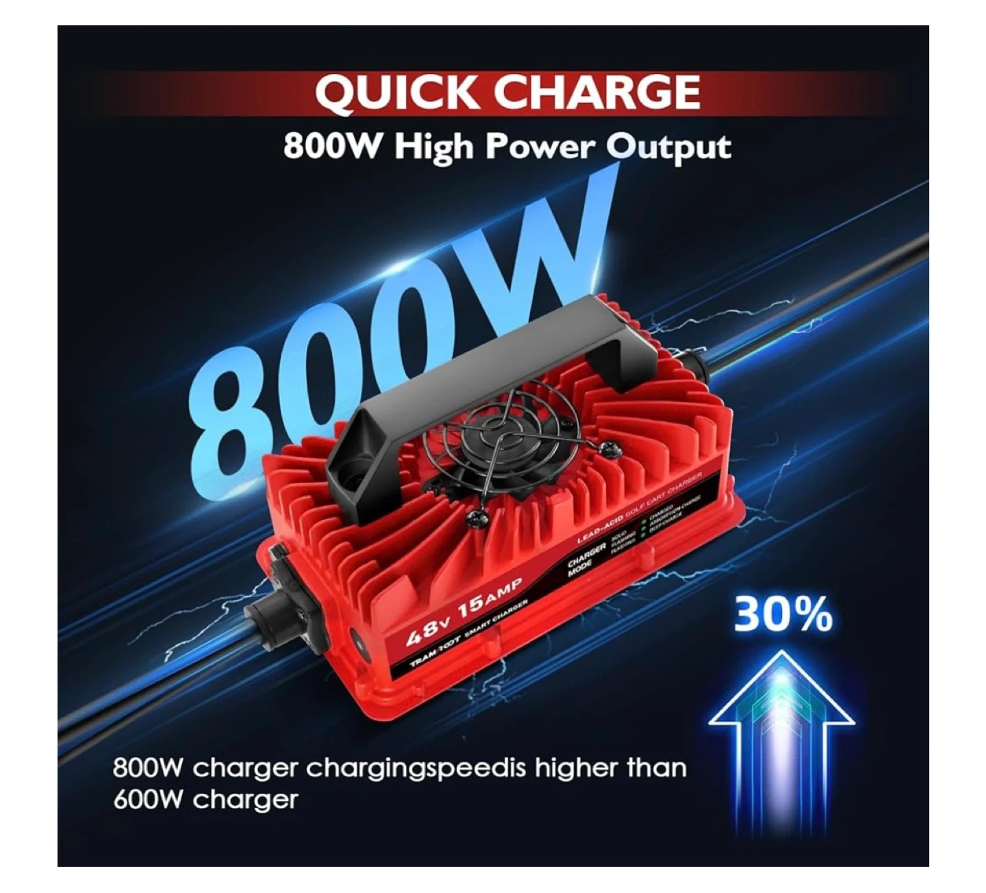Selling a TRAMROOT 15 Amp golf cart charger for 48 Volt Yamaha G29 Drive & Drive 2 Lead Acid Battery. It features an upgraded 3-Pin Leaf Plug and a one-piece solid molding plug that solves copper core skewing and ensures reliable insertion. The charger has enhanced thermal conductivity and insulation performance, with a neat and beautiful appearance. It also features a smart charging mode and an 800W high power output for quick charging
