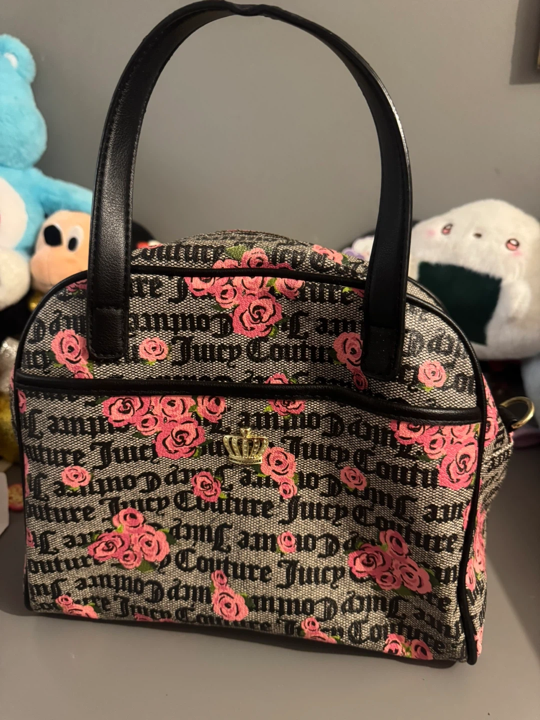 This Juicy Couture handbag features a classic monogram print with a vibrant rose pattern. It has a top zip closure and black leather handles. It's a stylish accessory for your everyday essentials!