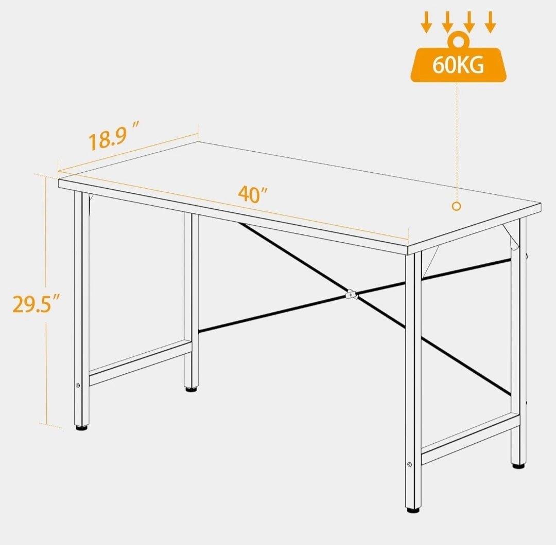 This white study desk features a metal frame for high stability. It measures 40" long by 18.9" deep and stands 29.5" tall. The desk has an X frame design providing strong support. It's suitable for home office use.