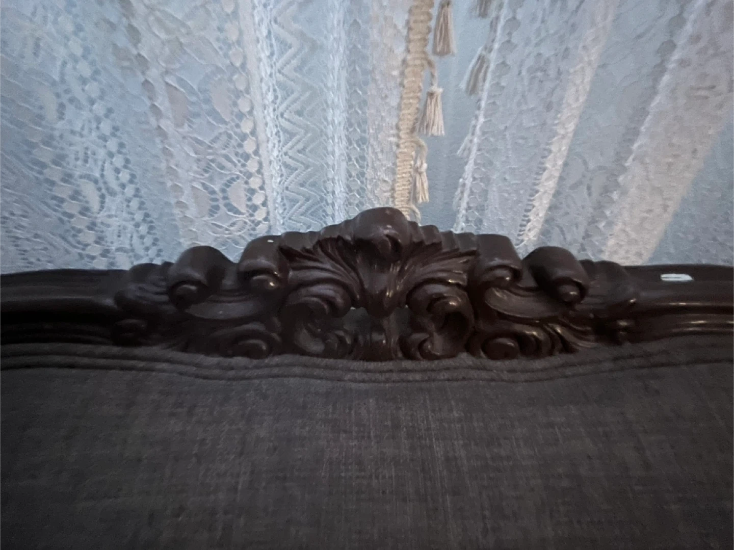 This loveseat features a dark upholstered fabric and ornate carved dark wood accents on the arms and crest. It's a two-seater couch with a classic design. The frame is made of solid wood, and the upholstery appears to be a durable linen-blend fabric.