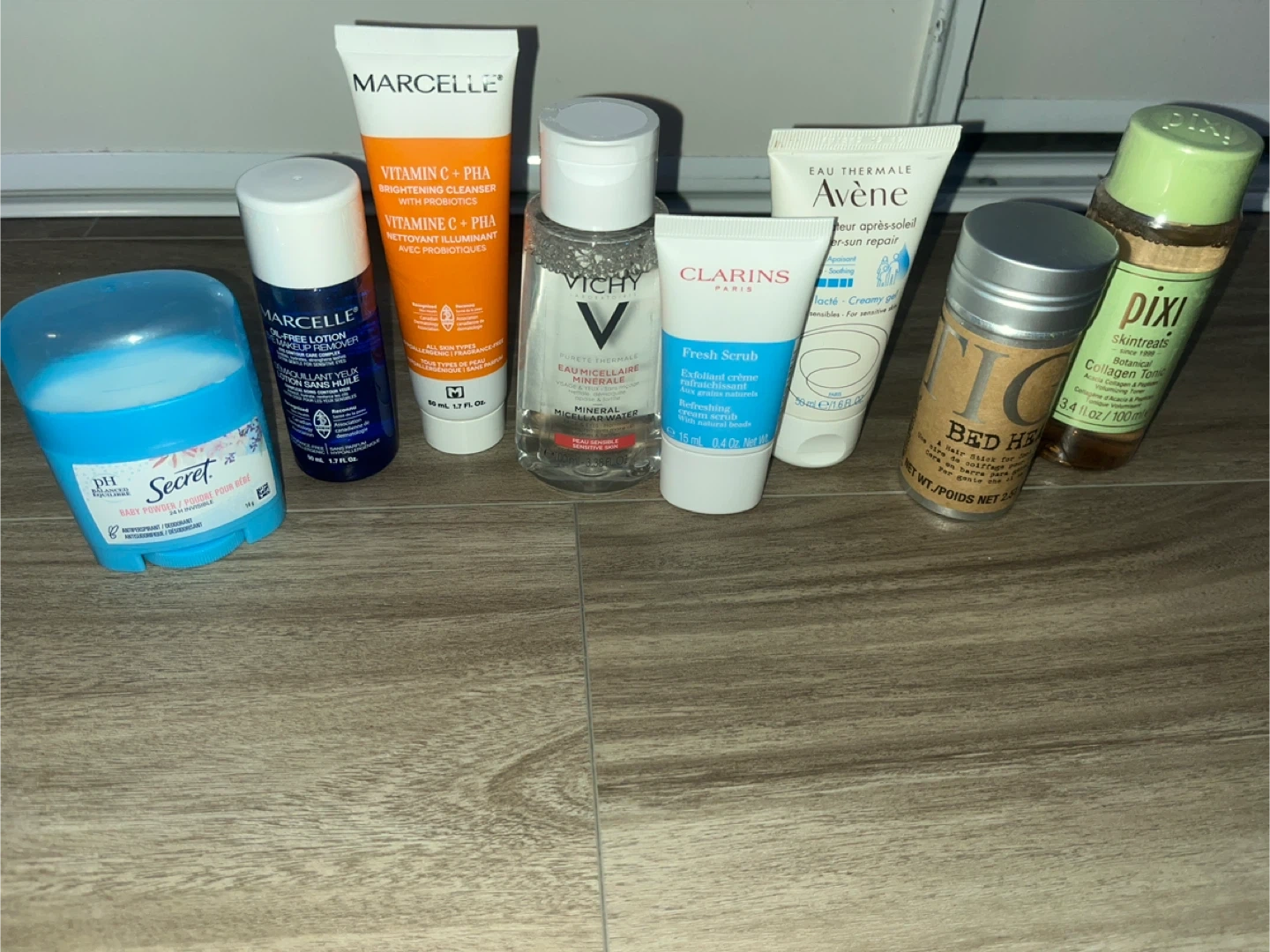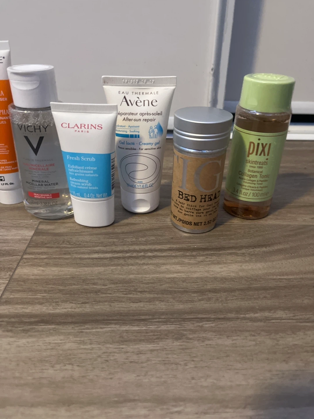 A collection of skincare and hair items including Clarins, Vichy, Avene, Pixi, Marcelle, and Bed Head. Products include micellar water, face scrub, serum, after-sun repair, and hair sticks. Great for trying out new products or for travel!