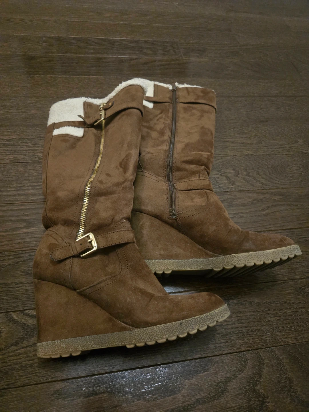 These Unisa knee high wedge boots are a rich brown colour. Full length zipper. Decorative exterior zipper and buckles. Fleece lined interior.