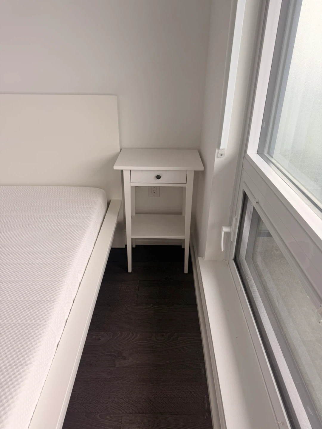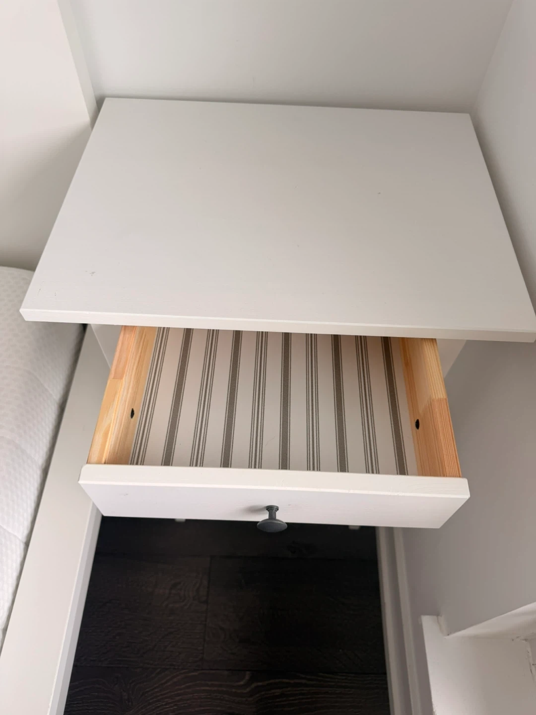 A clean white nightstand featuring a single drawer and an open shelf below.