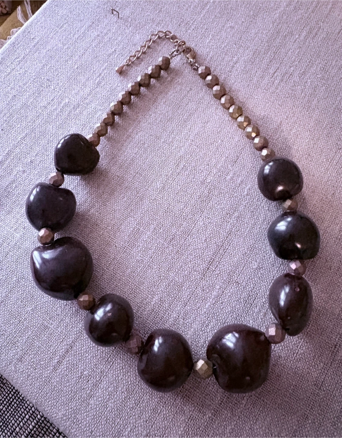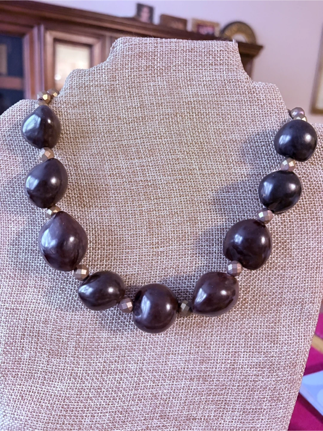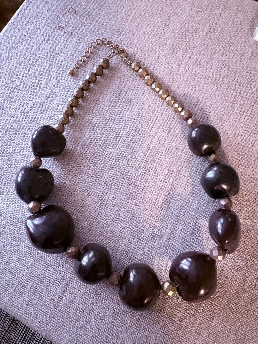 Chunky dark brown Kukui beads statement necklace with faceted Czech glass accents. Large, polished beads create a bold look. This piece adds a touch of drama to any outfit!