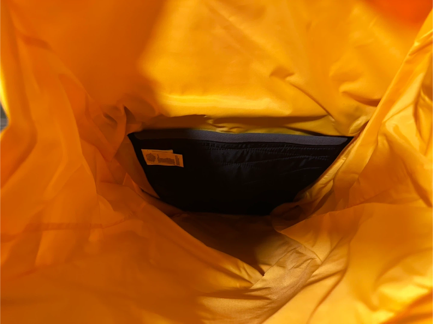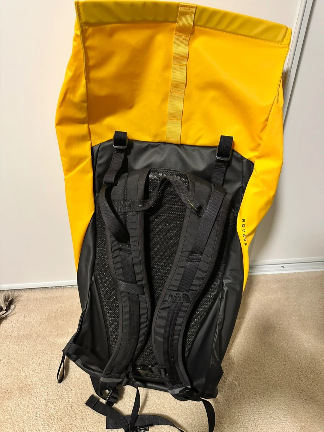 This is The North Face backpack in a bright yellow colour. It features a roll-top closure and a padded laptop sleeve inside. It's great for everyday use or for short trips! 27L
