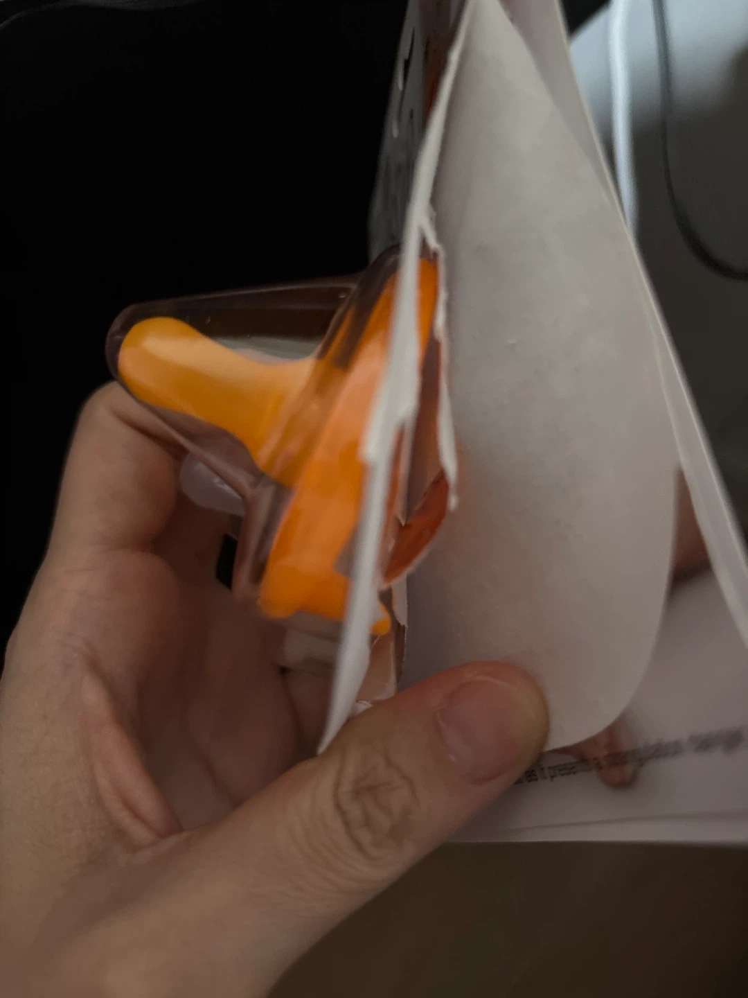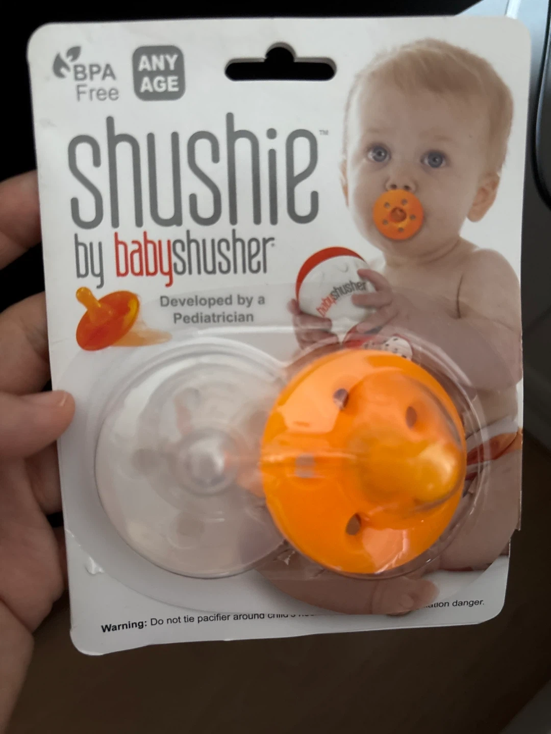 This Shushie pacifier is made by BabyShusher. It's BPA-free and developed by a pediatrician. The pacifier is orange and designed for any age. Open but not used.