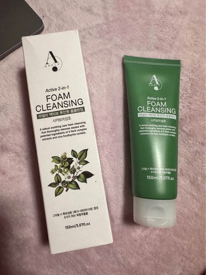 ANELY Active 2-in-1 Foam Cleansing facial cleanser, which contains patented herbal complex extracts and cica for sebum care and deep cleansing. Brand: ANELY. Product Type: 2-in-1 Foam Cleanser. Key Ingredients: Cica (Centella Asiatica), Houttuynia Cordata, and a patented 6-Herb complex (Grinohl H). Size: 150ml / 5.07 fl. oz.