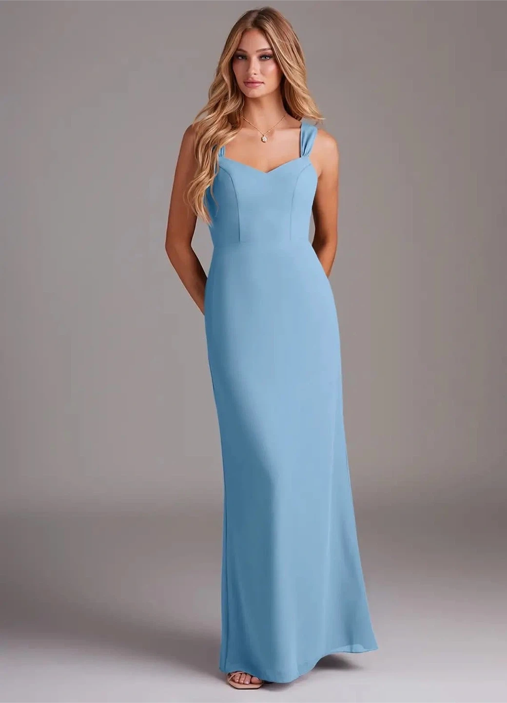 1. Azazie Denice Steel Blue Sheath Pleated Chiffon Dress size A14-$30