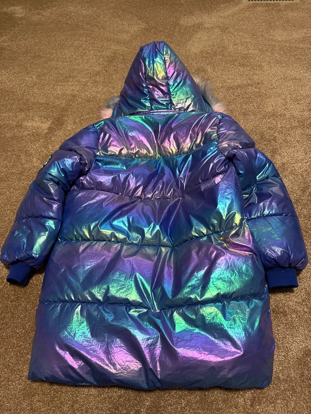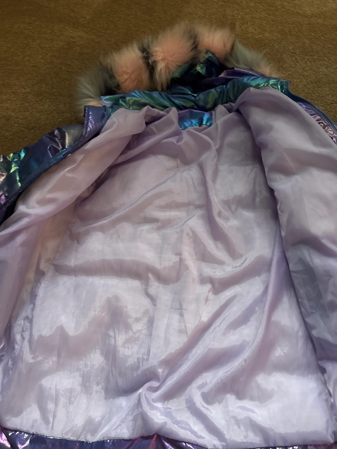 Shiny iridescent puffer coat with faux fur trim on the hood. It's a long-style jacket with ribbed cuffs. Purple and blue colour-shifting exterior.