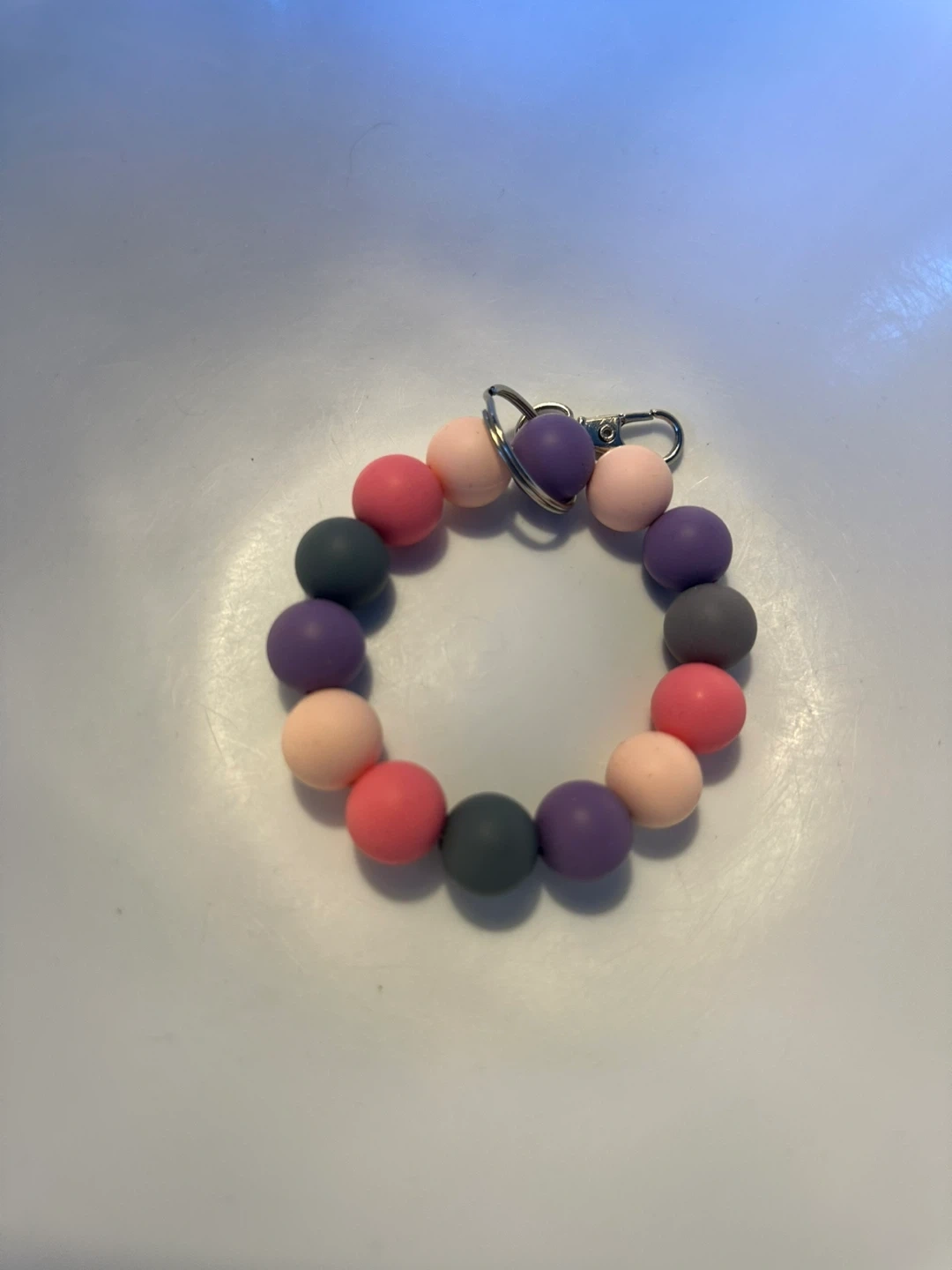 65Cute beaded bracelet keychain with a variety of colours, including pink, purple, grey and peach! Perfect for keeping your keys handy and adding a pop of colour to your day