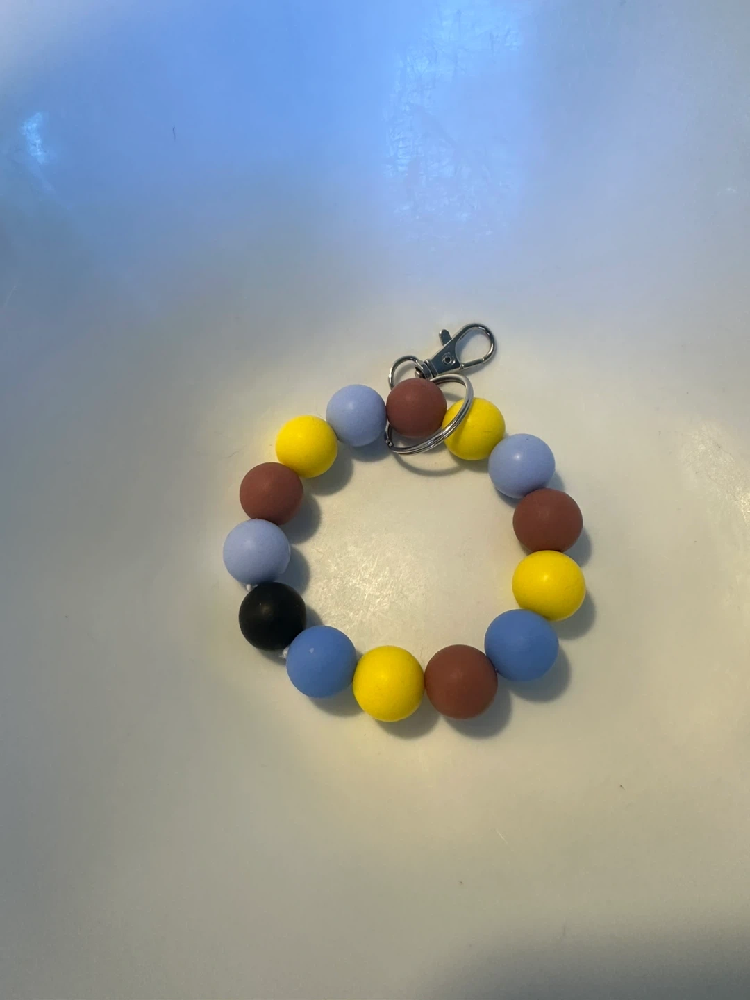 This is a cute beaded bracelet keychain! It features colourful beads in shades of blue, yellow, brown, and black. Perfect for keeping your keys handy and adding a pop of colour to your bag or wrist