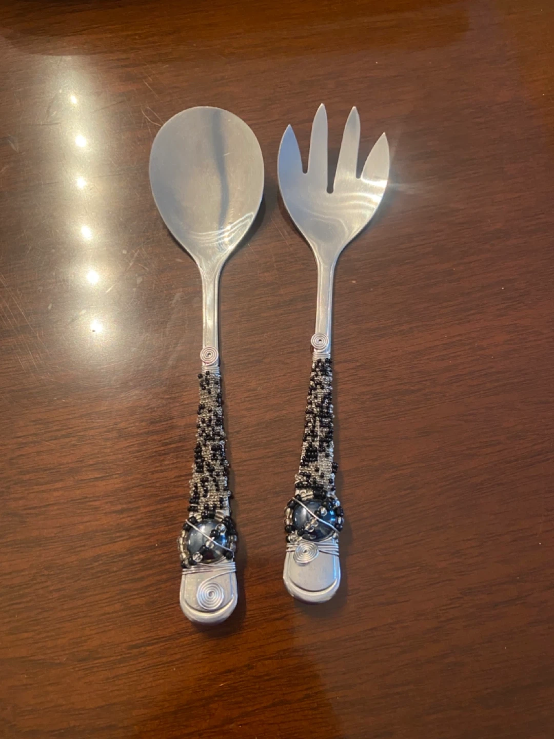 30Add a touch of elegance to your table with this unique salad serving set! Includes a spoon and fork, both featuring beautiful beaded handles. Perfect for serving up your favourite salads at dinner parties or family gatherings