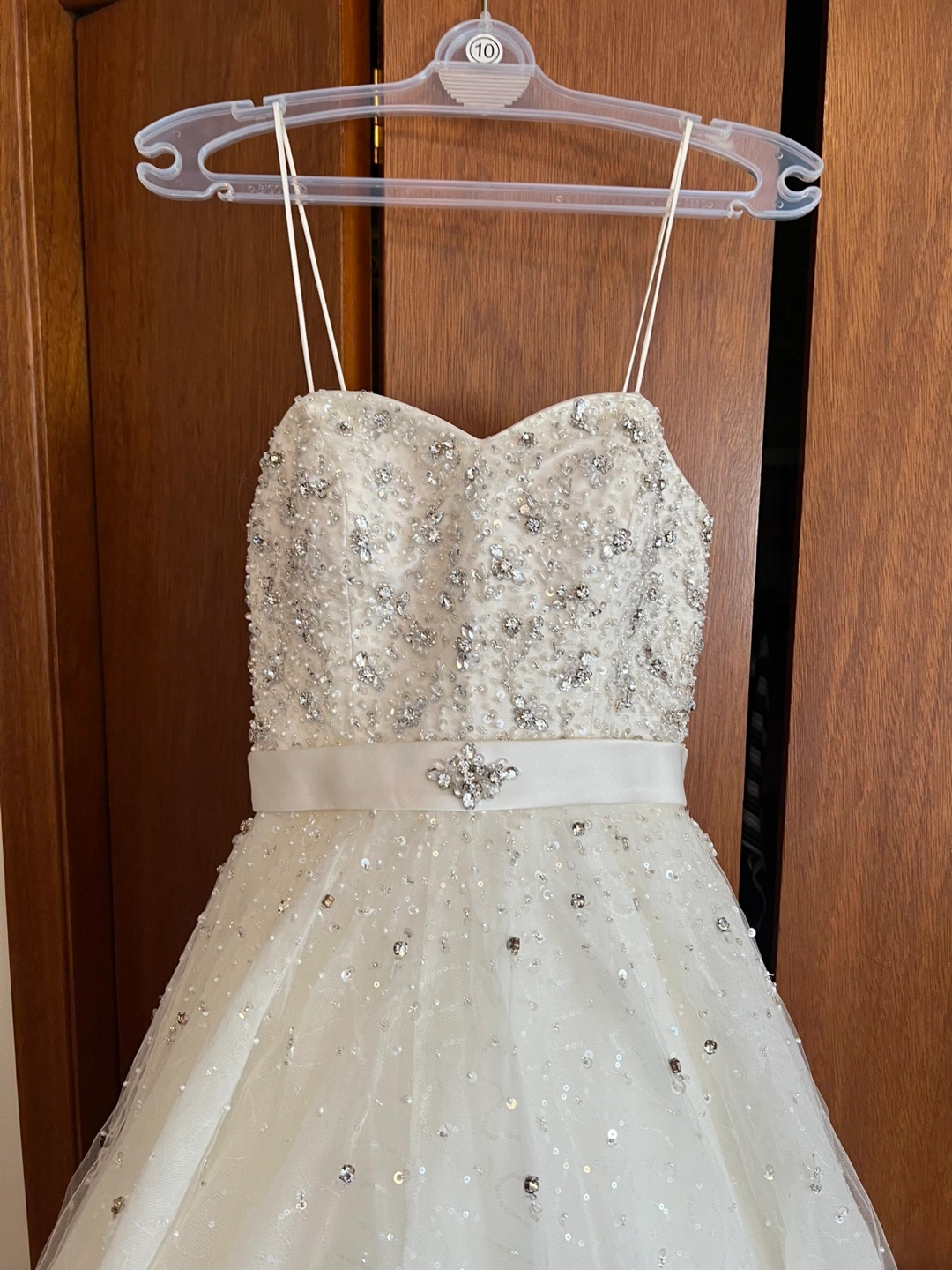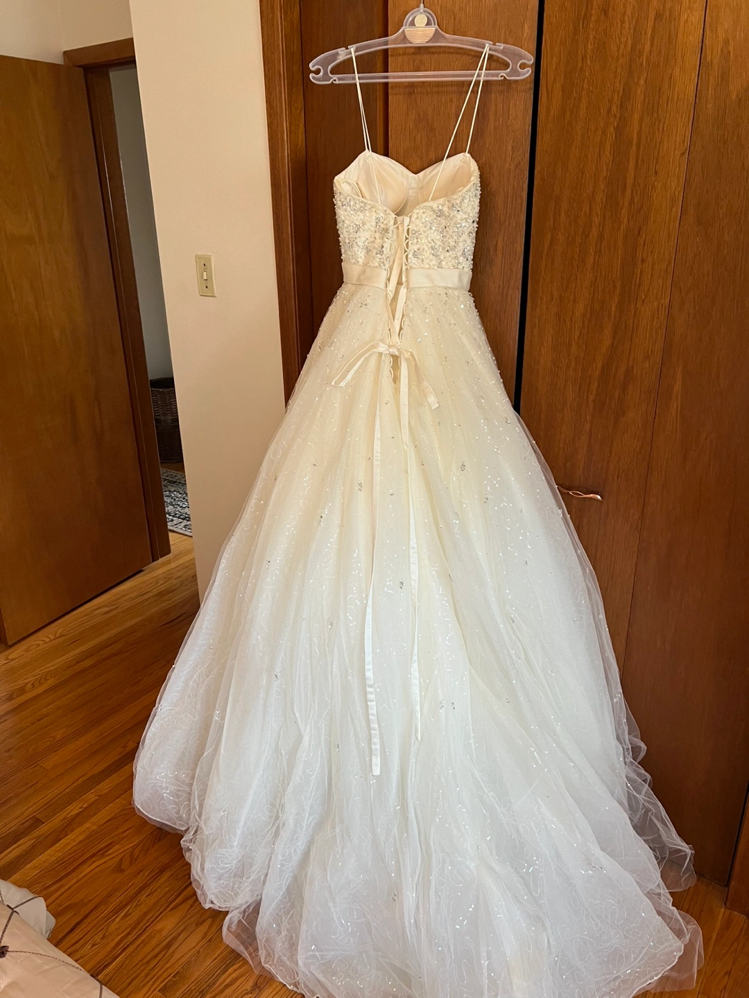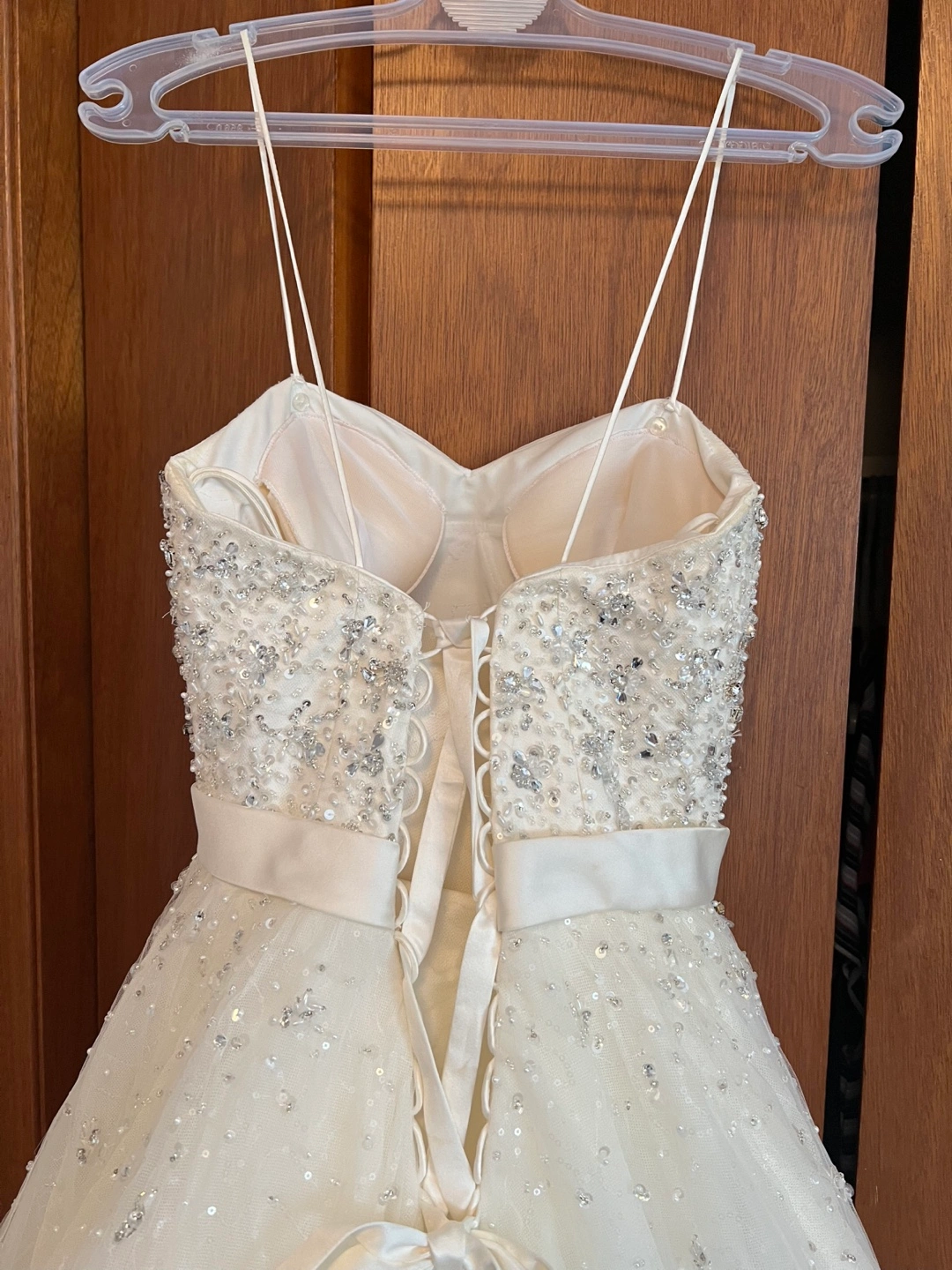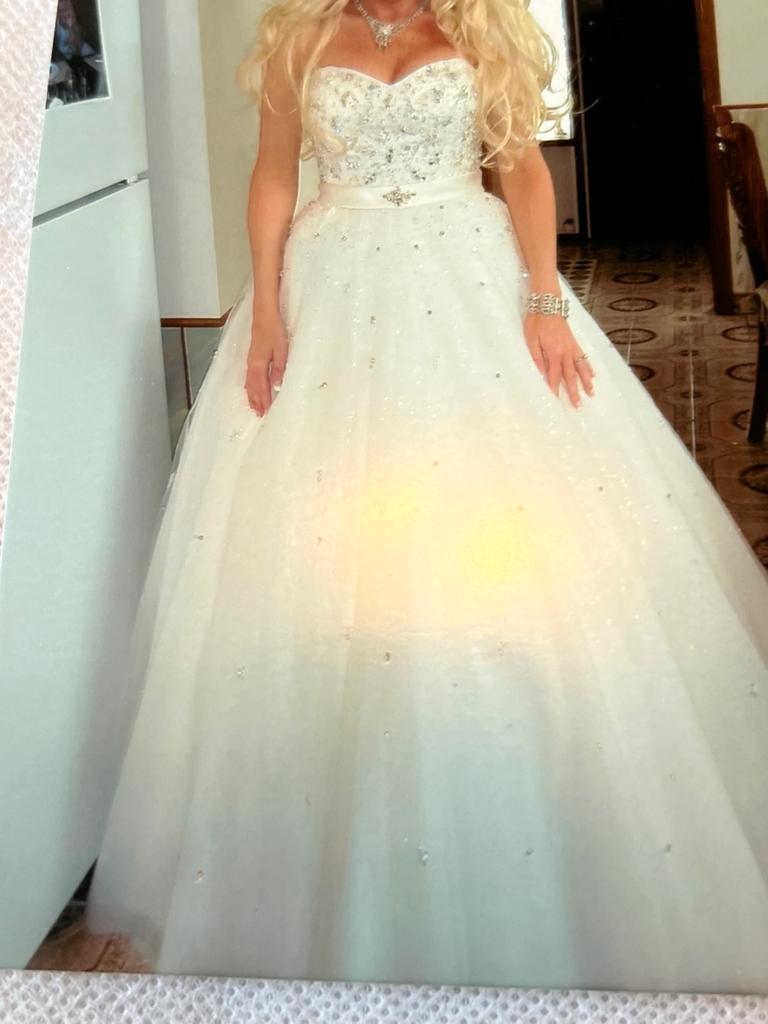 119Beautiful white/ivory colour wedding dress. Size 8. It's vintage (10 yrs old), ballgown/princess style. Features a sweetheart neckline, beaded bodice, and tulle skirt. Back is lace up closure. Worn once for 3 hours.