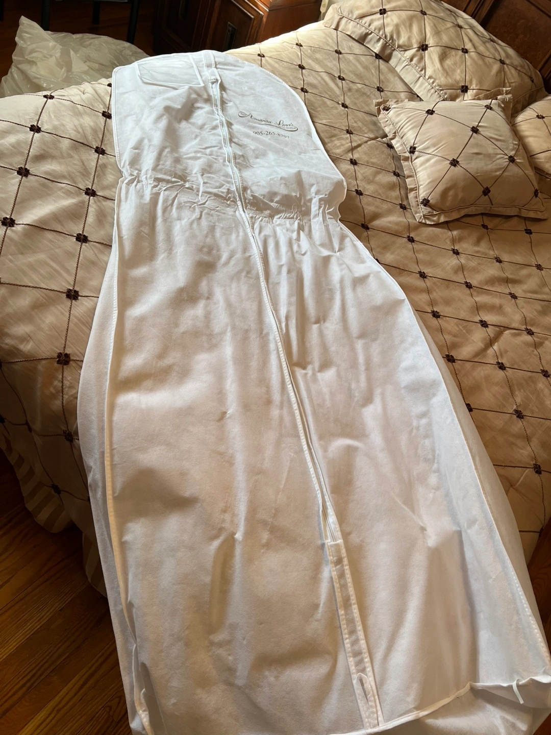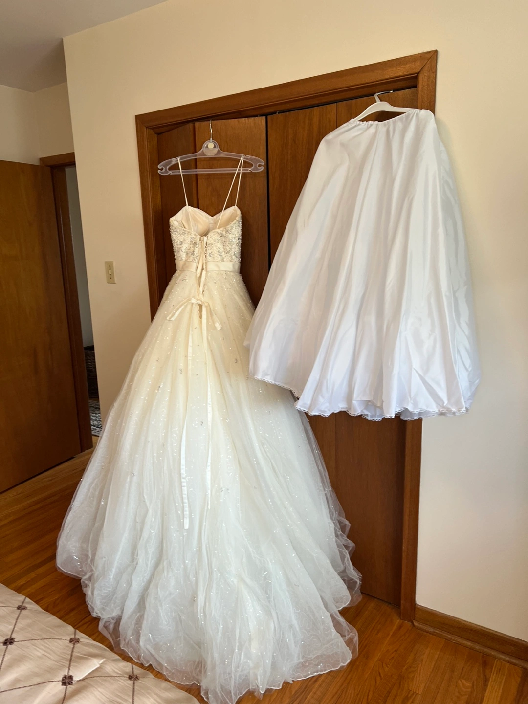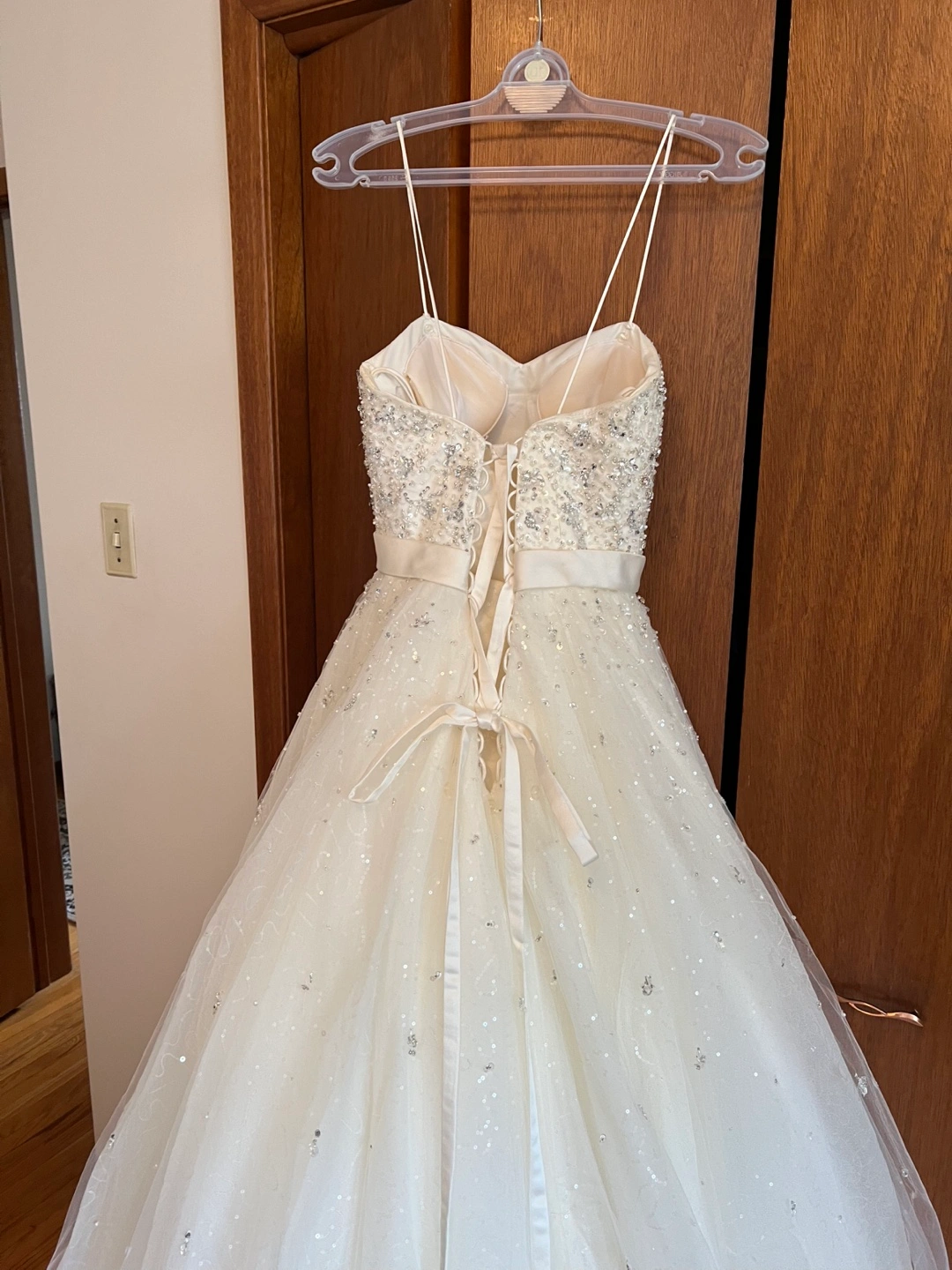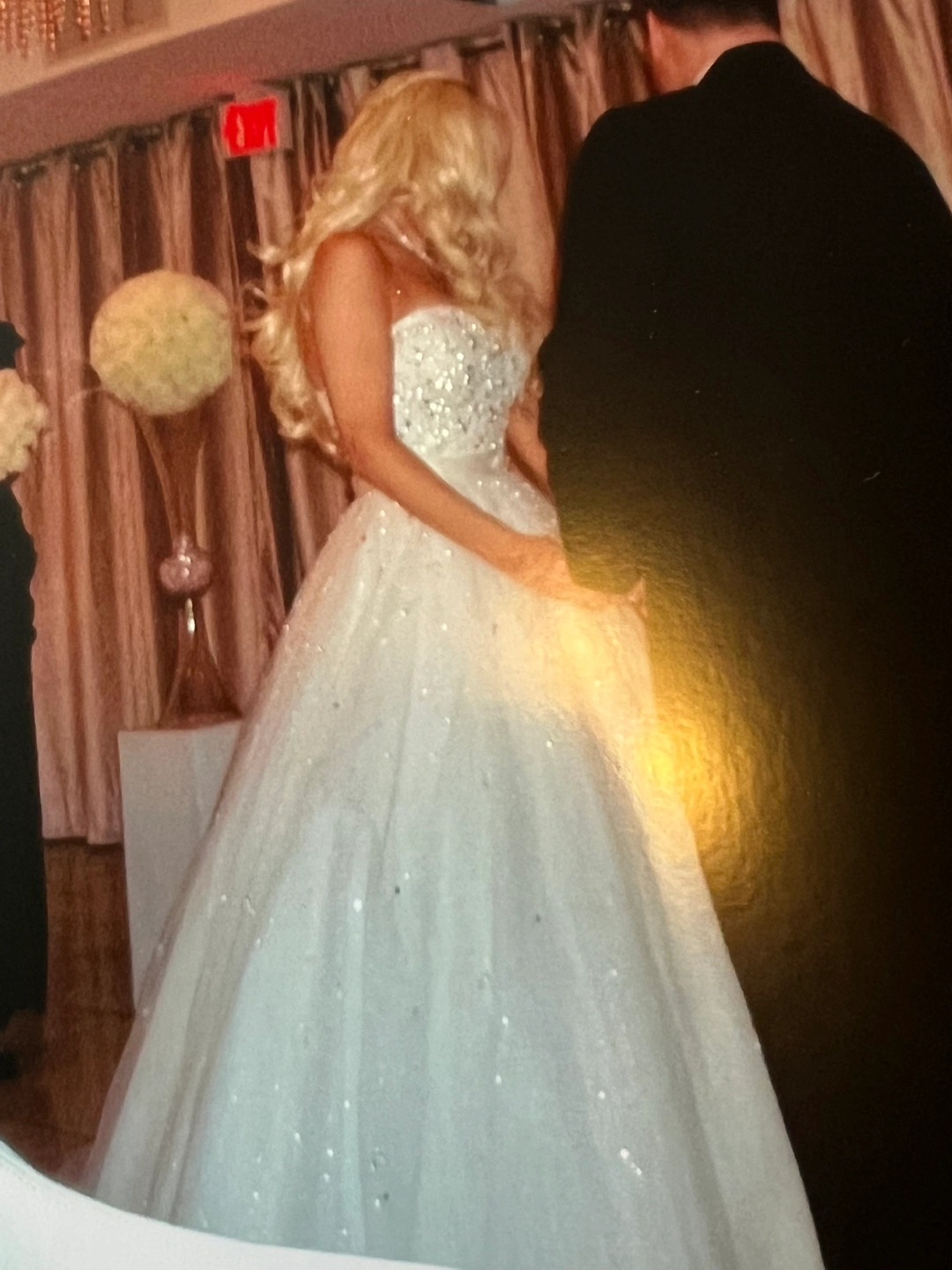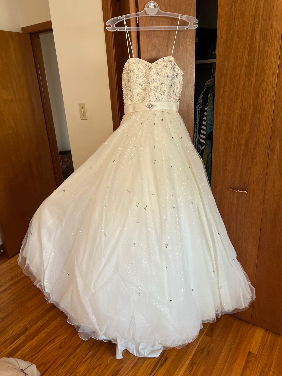 119Beautiful white/ivory colour wedding dress. Size 8. It's vintage (10 yrs old), ballgown/princess style. Features a sweetheart neckline, beaded bodice, and tulle skirt. Back is lace up closure. Worn once for 3 hours.