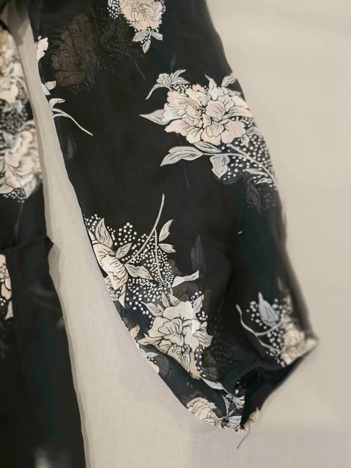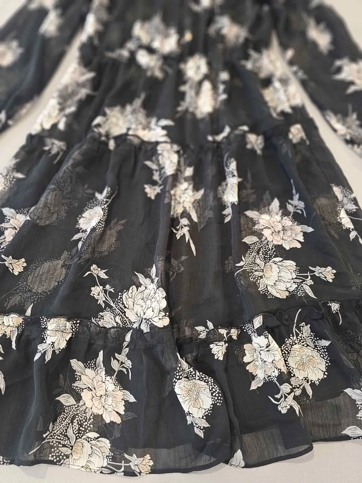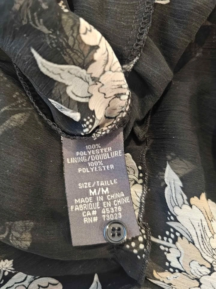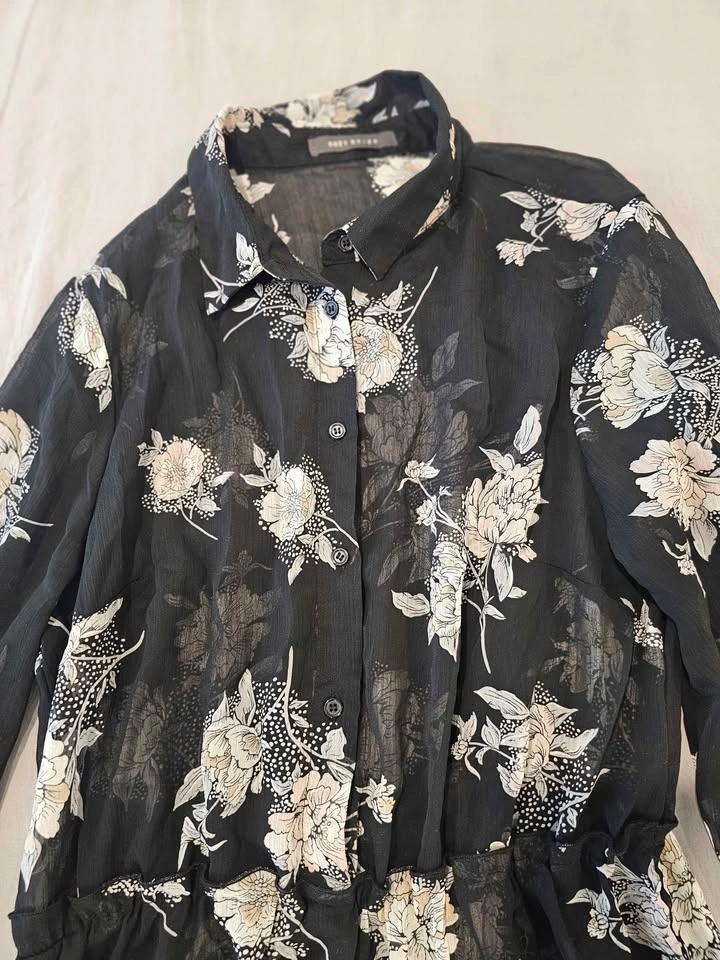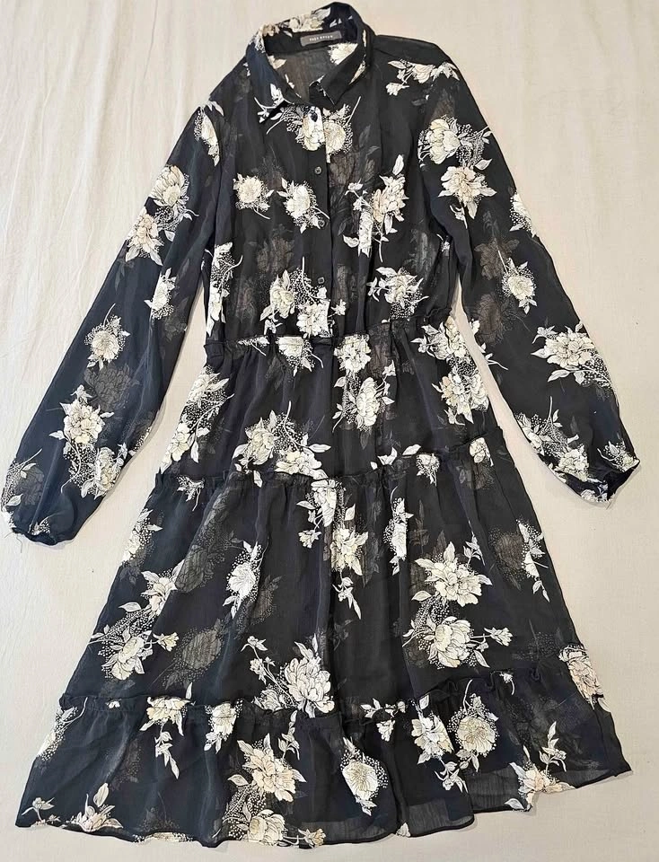 Pretty Suzy Shier black floral dress. Long sleeve, button up front. Has a collar and tiered skirt. Sheer fabric, super flowy. Great for spring or fall. Relaxed fit. Size Medium