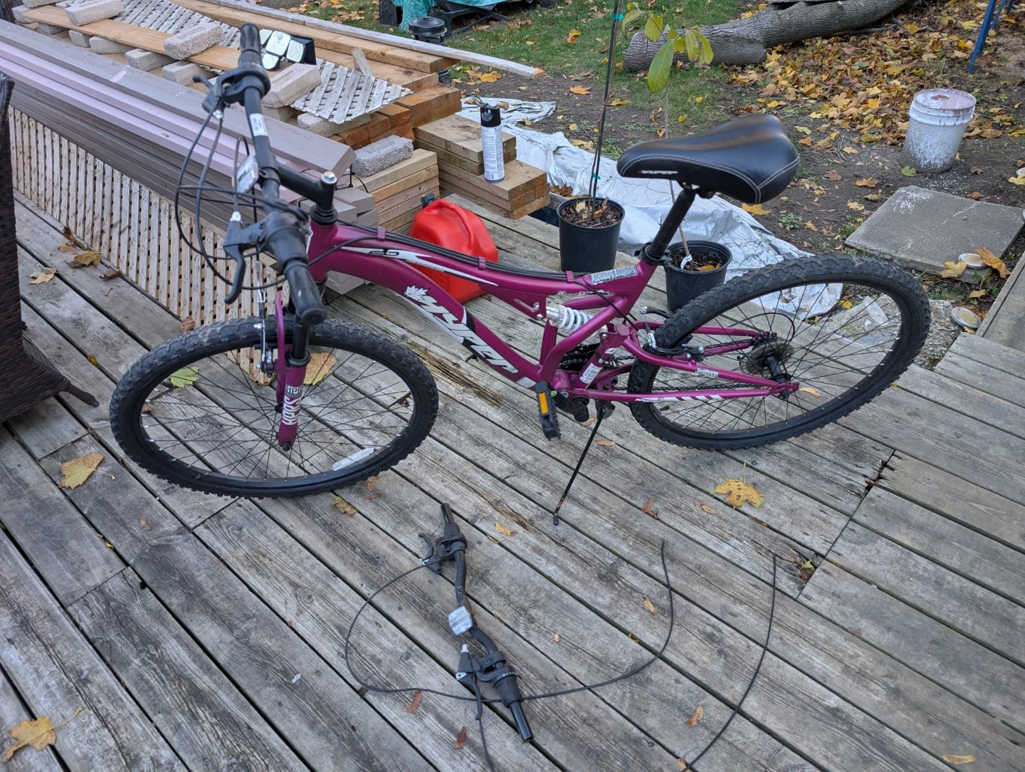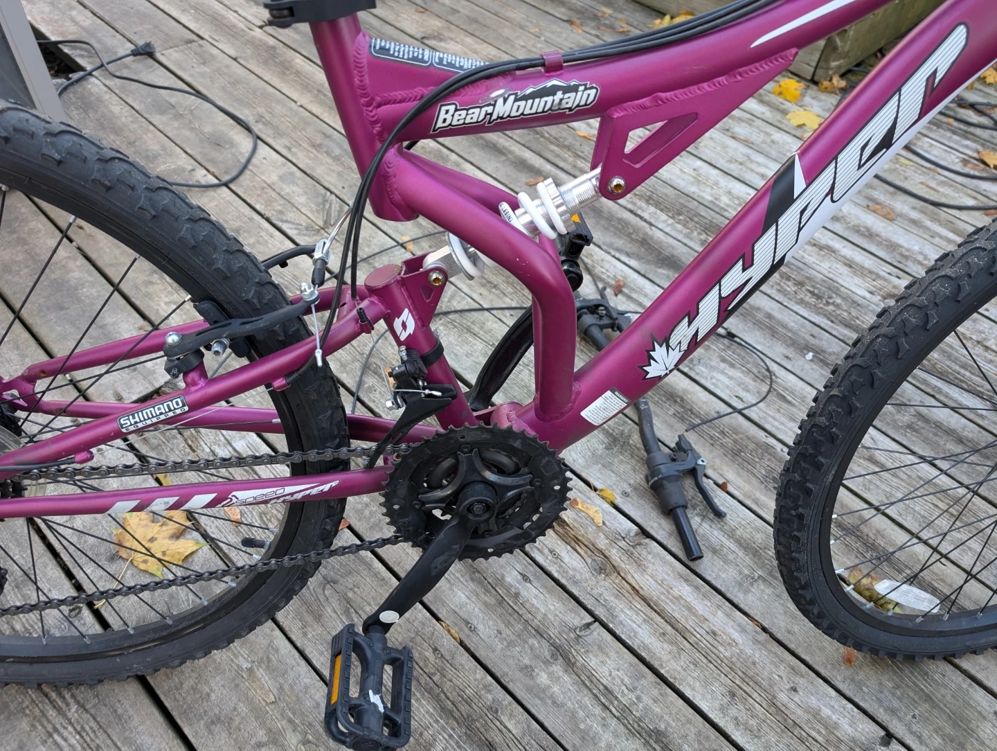 230Bear Mountain Hyper 21 speed purple bicycle for sale. Left gear shifter is broken, comes with spare steering wheel, just don’t have time to fix or replace. Dual shock mountain bike, seat is in excellent condition, rest of the bike is good, Shimano equipped gears. $40 FIRM.