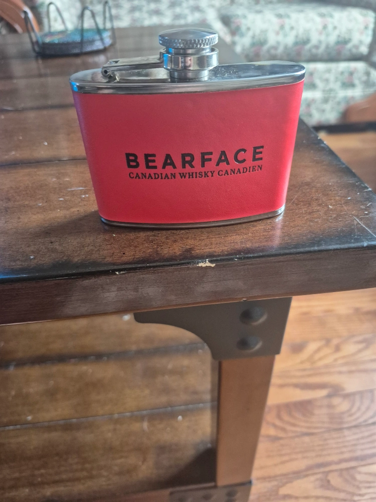 68Selling a gently used Bearface Canadian Whisky flask in red. It's perfect for enjoying your favourite Canadian whisky on the go! It's in good condition and ready for a new home
