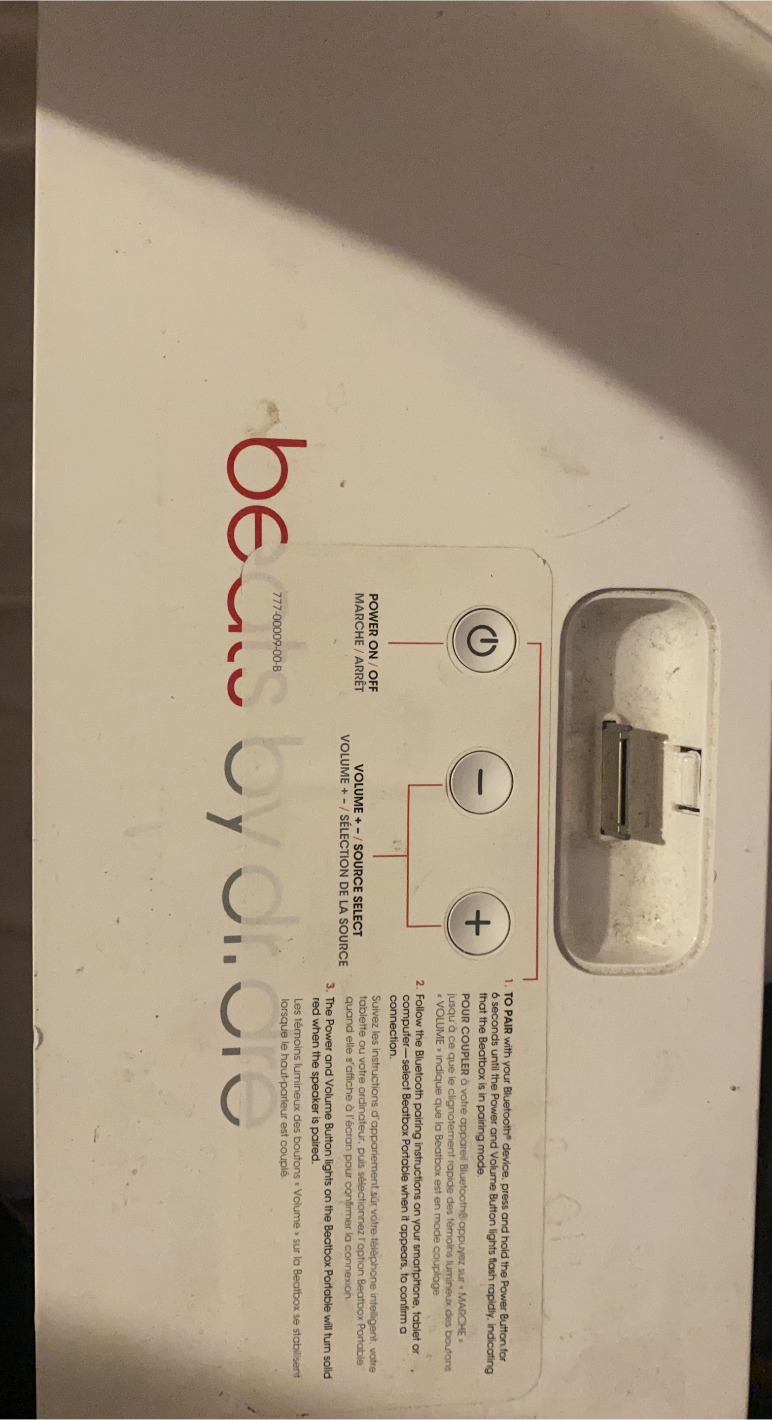 Selling a Beats by Dr. Dre Beatbox Portable speaker. The speaker has a power on/off button and volume control. To pair with your Bluetooth device, press and hold the power button for 6 seconds until the power and volume button lights flash rapidly, indicating that the Beatbox is in pairing mode