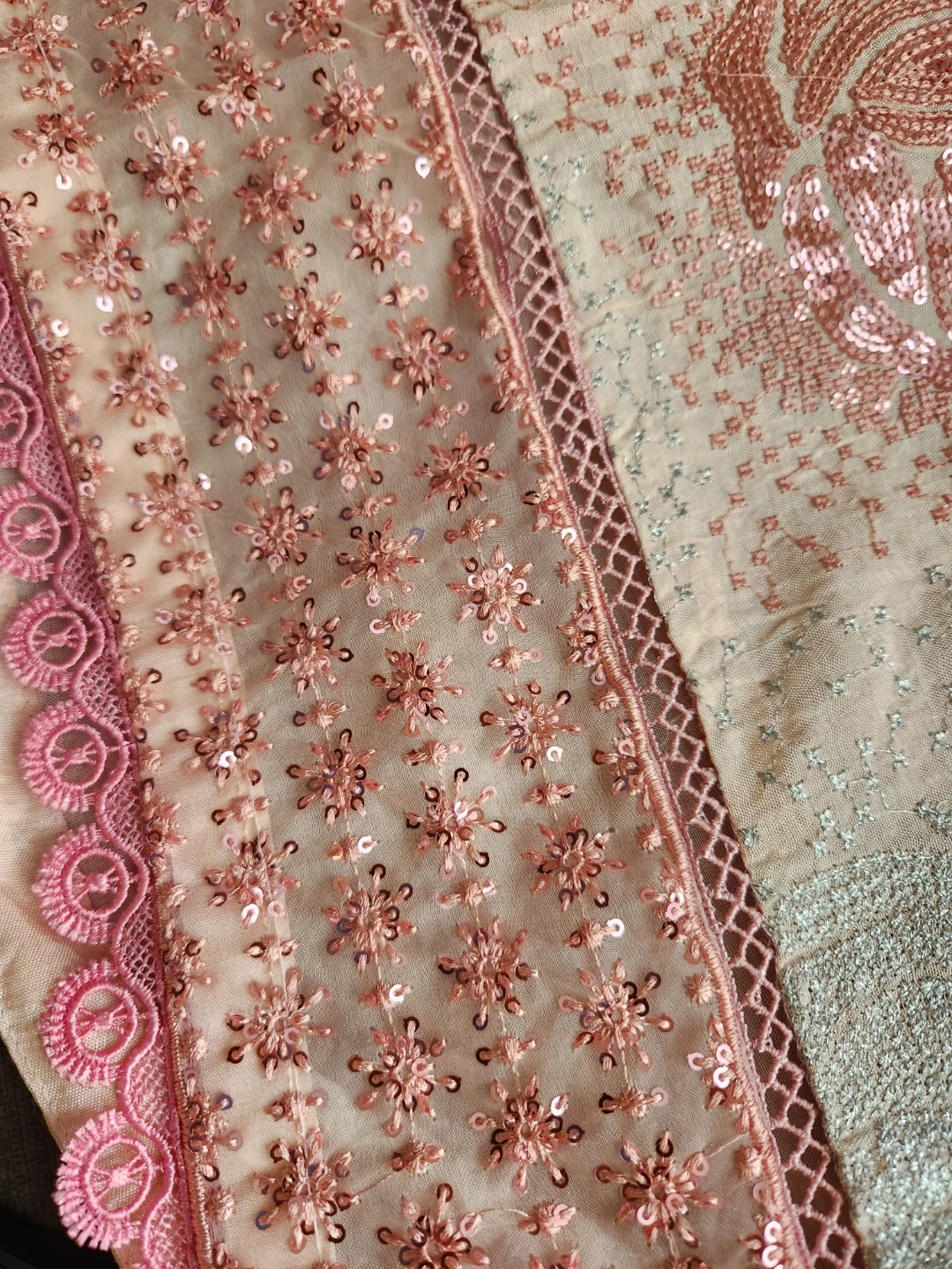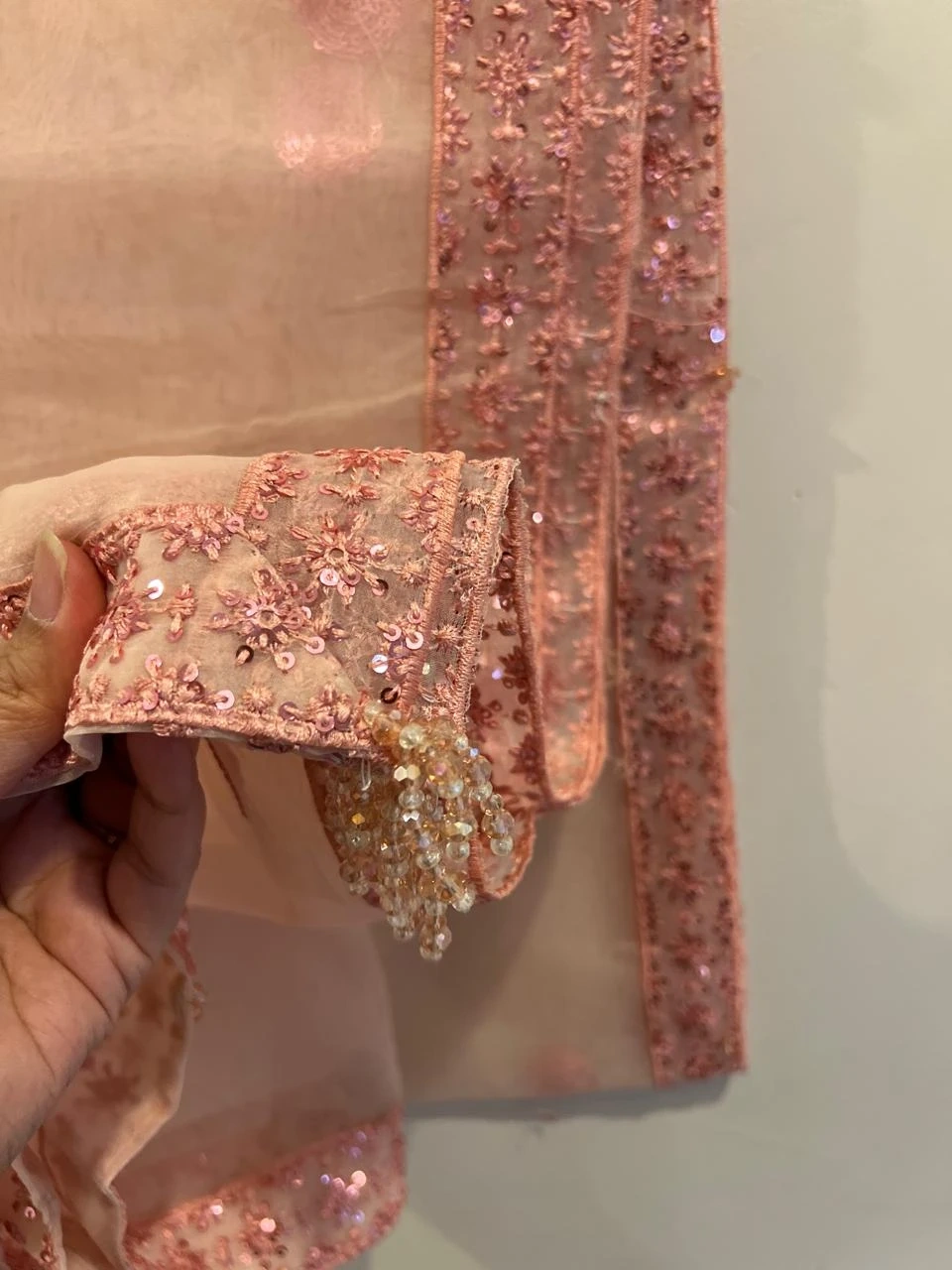 15Beautiful peach colour 3 pcs sequence work suit. Raw silk trousers. Soft organza dupatta. Size Xl ( chest size 25) Brand new Check other listings too Door pick up also available