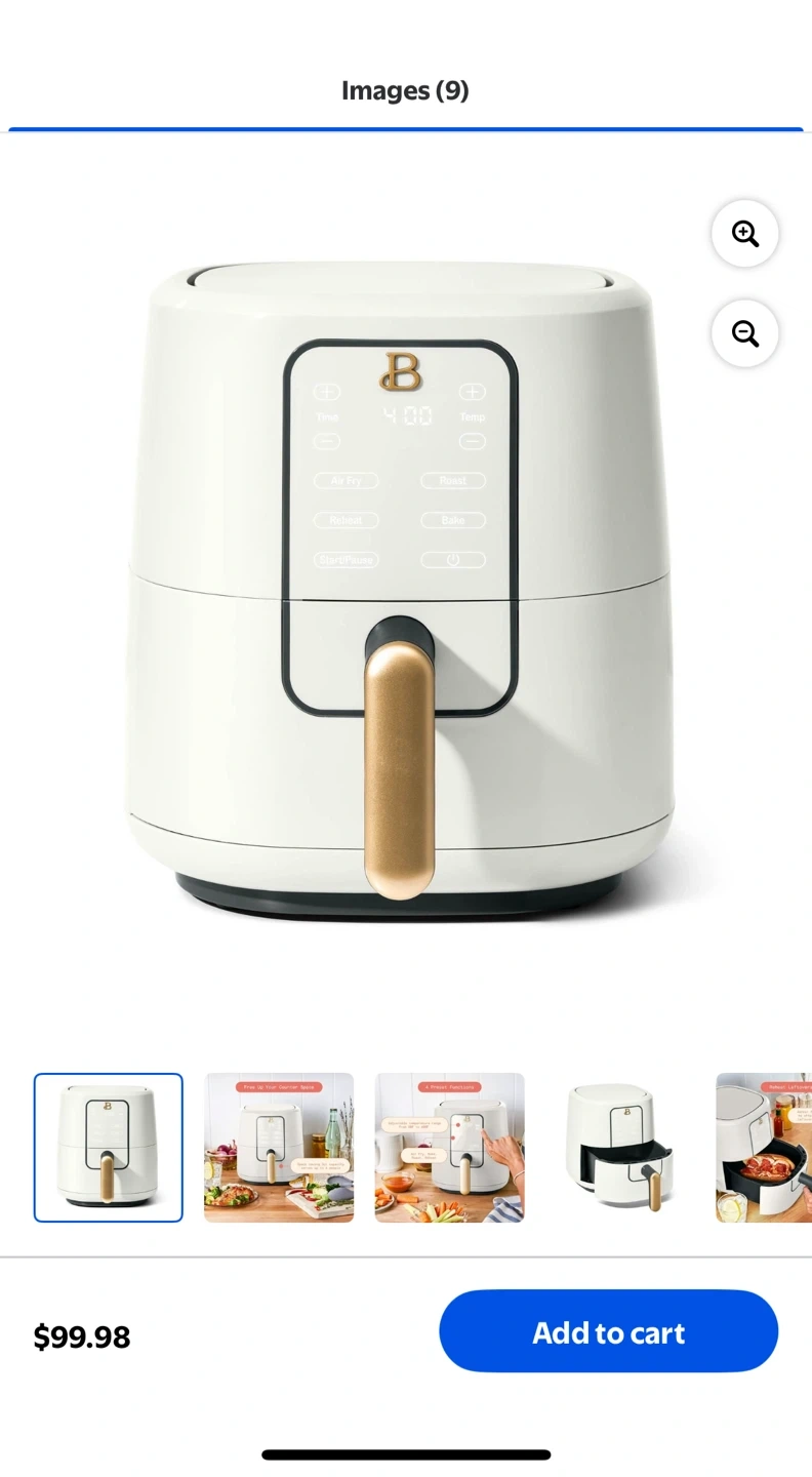 Selling a cream-coloured air fryer from the brand Beautiful. It features a digital display with preset functions for air frying, roasting, reheating, and baking. Bought new a couple months ago, used it rarely, in condition like new, we even have the box. The original price was $99.98.