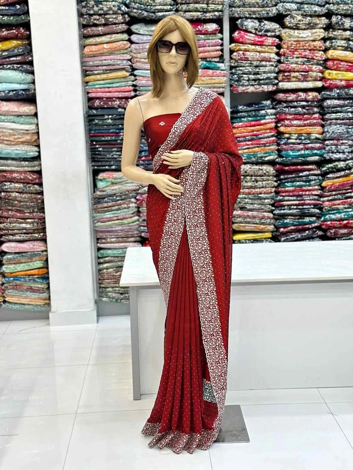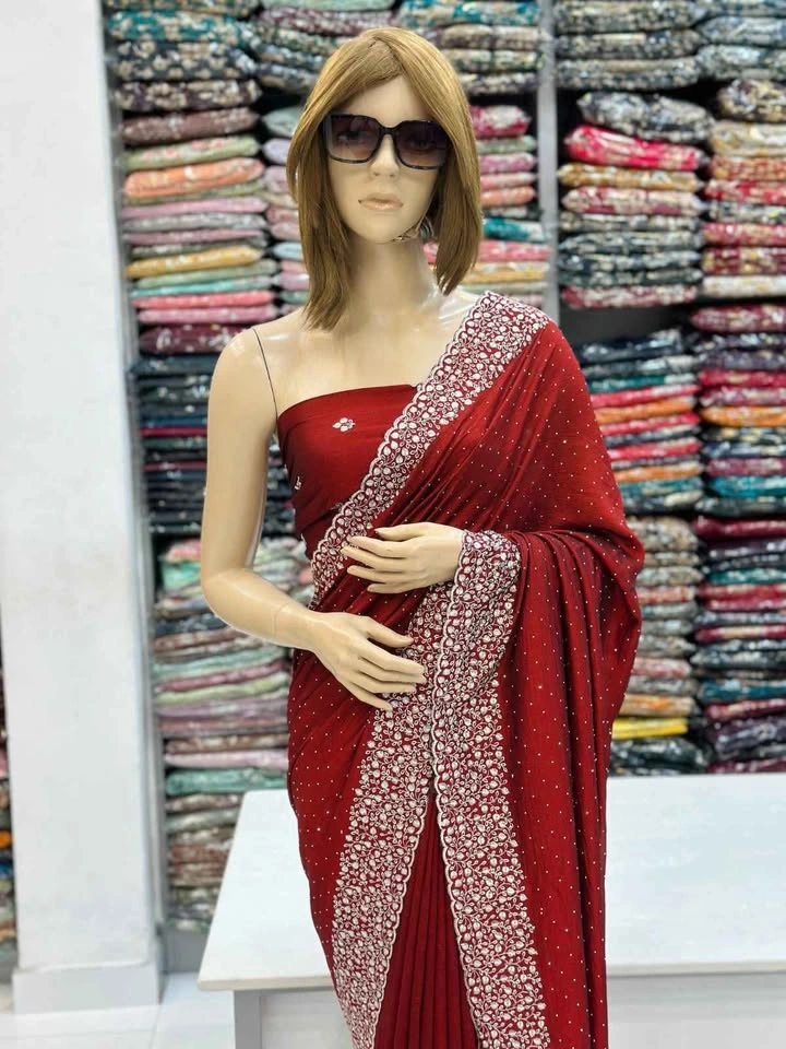 0Beautiful party wear saree. Work havey Embroidery and dimond. Blouse full stitched with 5 inch sleeves. Size 36 to 56.