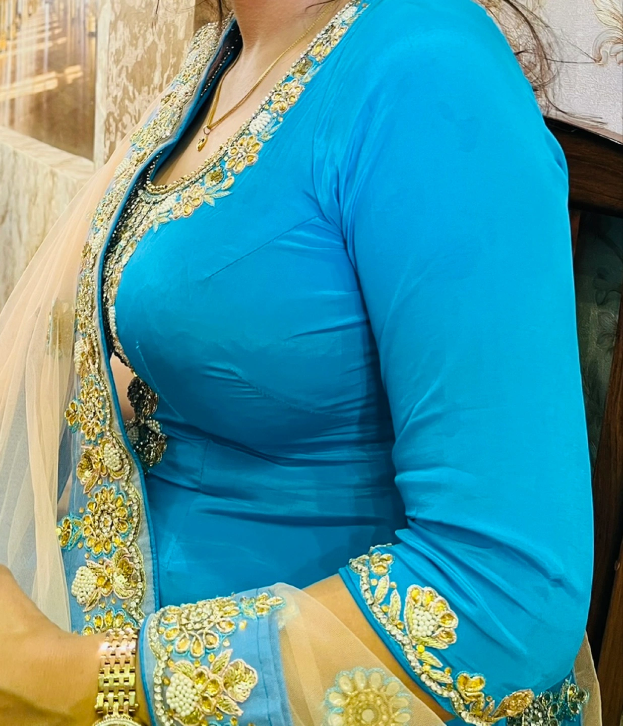 10Stunning teal blue salwar kameez with peach colour embroidered dupta. Bouquet suit.Intricate embroidery and embellishments. Features a matching dupatta. Gorgeous for special occasions.