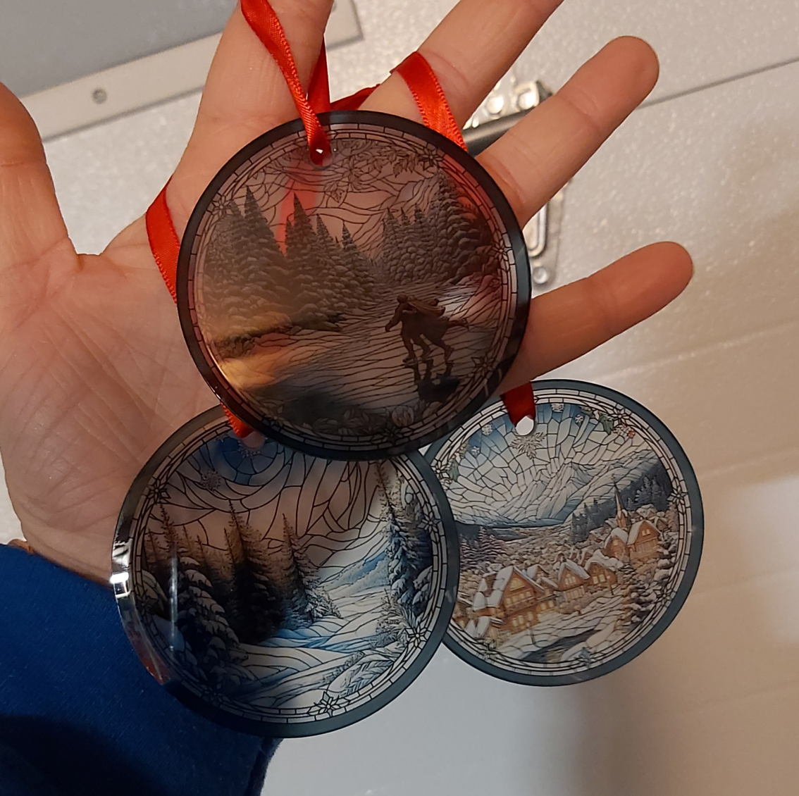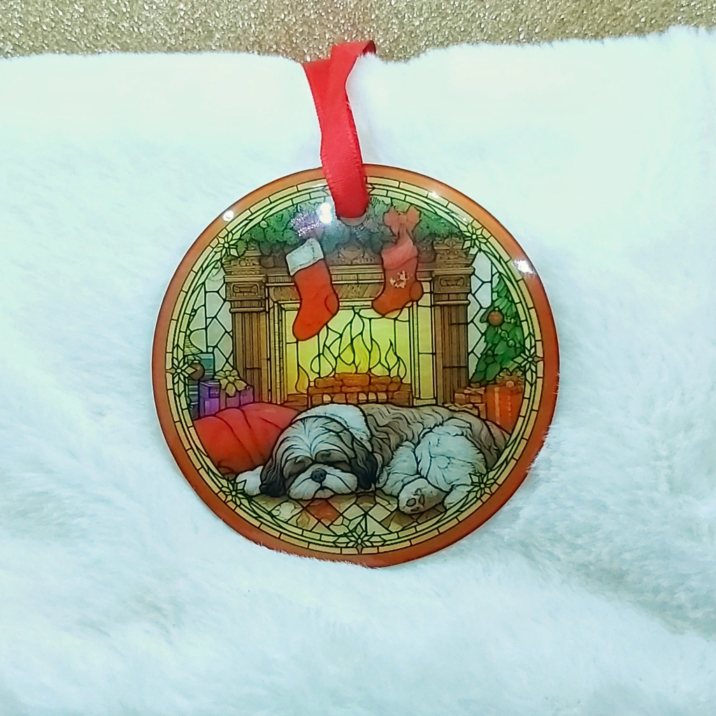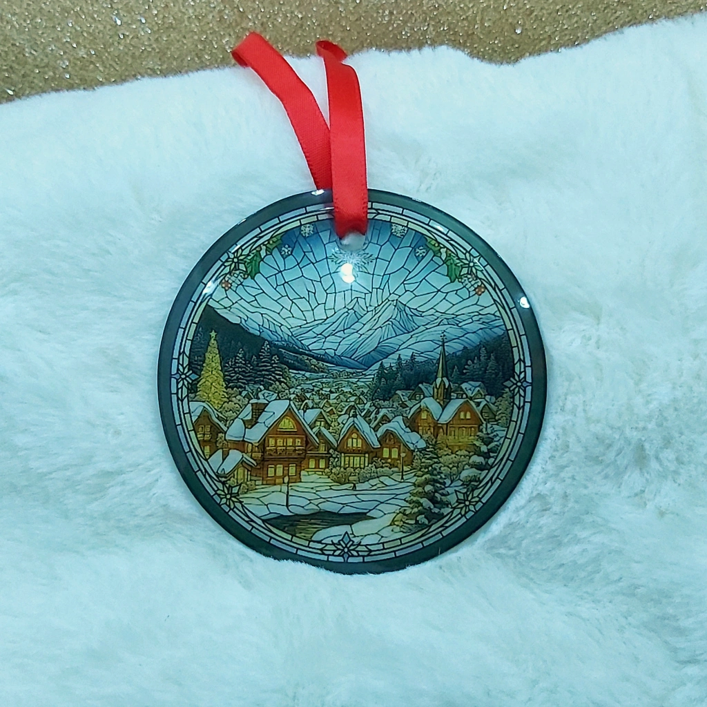 67These beautiful glass ornaments make a great addition to any Christmas tree! They are just over 3 inches round, and are very durable. They have a high gloss finish on the front and a frosty matte finish on the back. There is a warm set and a cool set, so they can fit any style. Each ornament is $15 OR a set of 3 for $40 OR both sets for $75 The designs shown were created by myself, through programming AI software! All the designs are unique and only available through me.