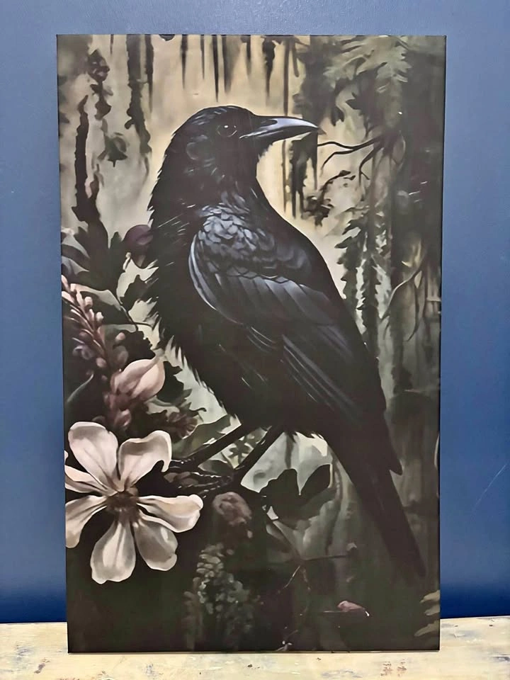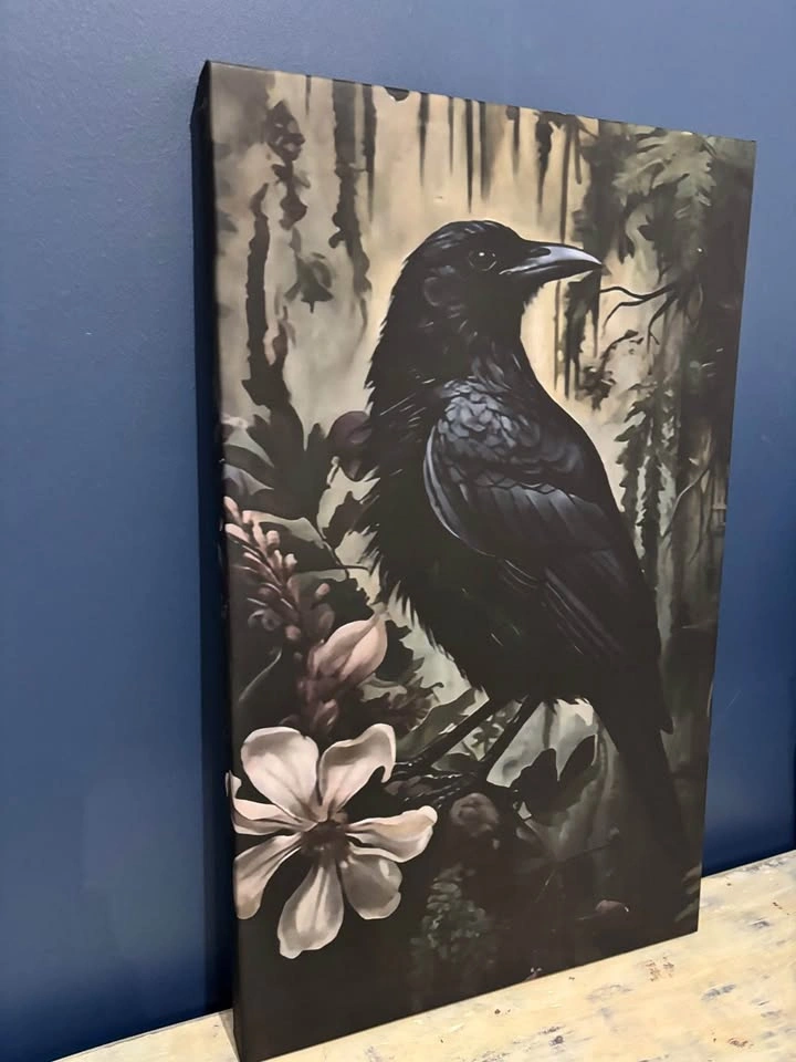 Beautiful floral raven print on matte canvas. Framed onto 25.5”X15.7”X1.5” wooden frame, light weight and ready to hang. Pick up in Bowmanville near Middle Rd and Northglen Blvd. Check out my other listings for more canvases.