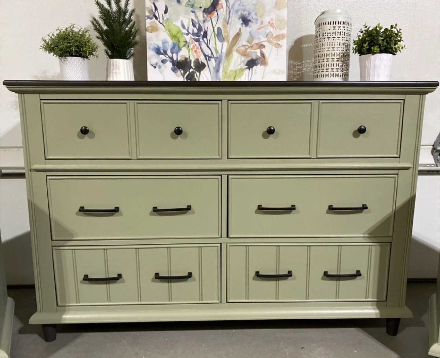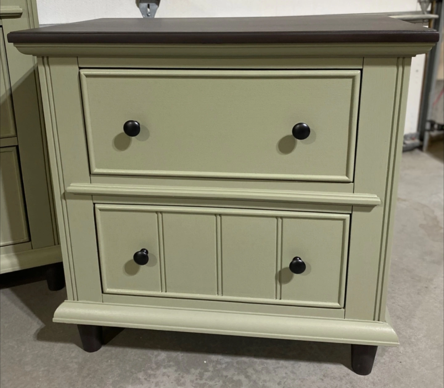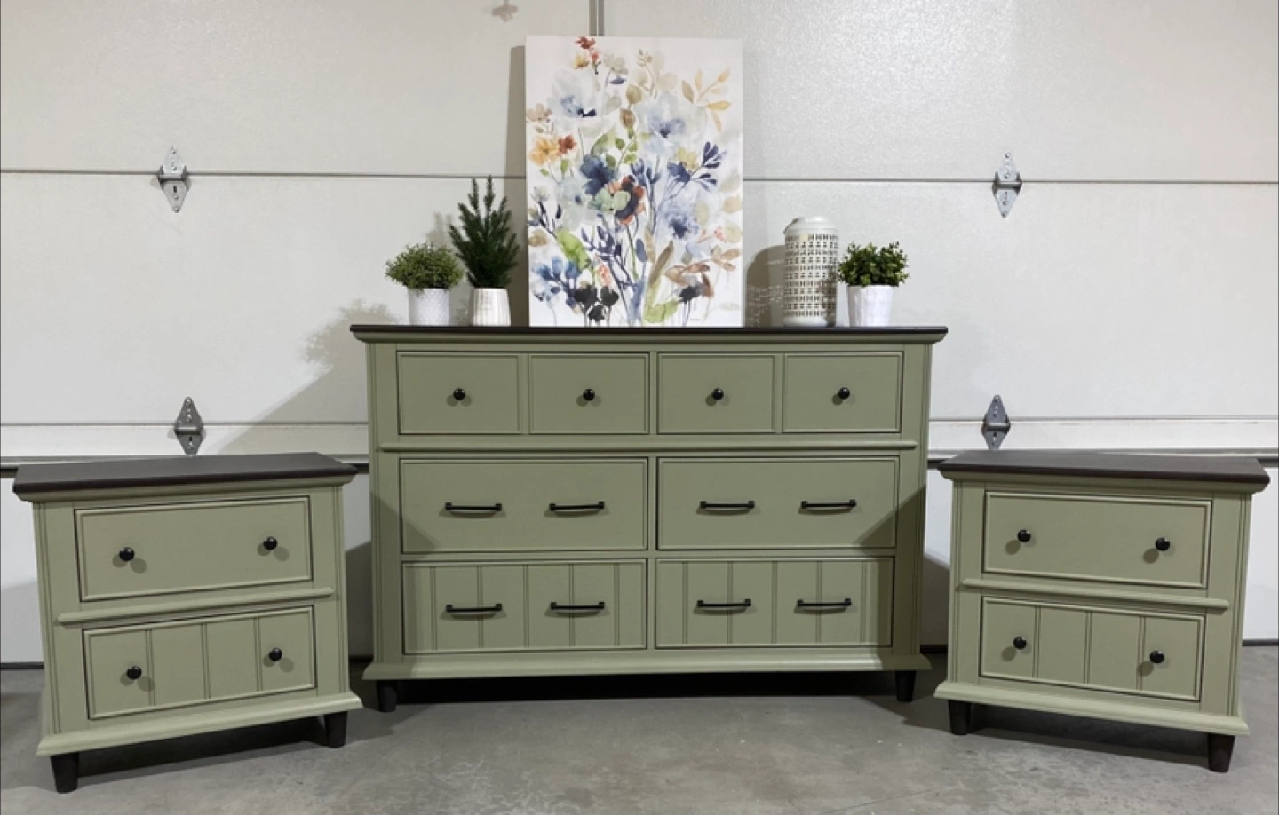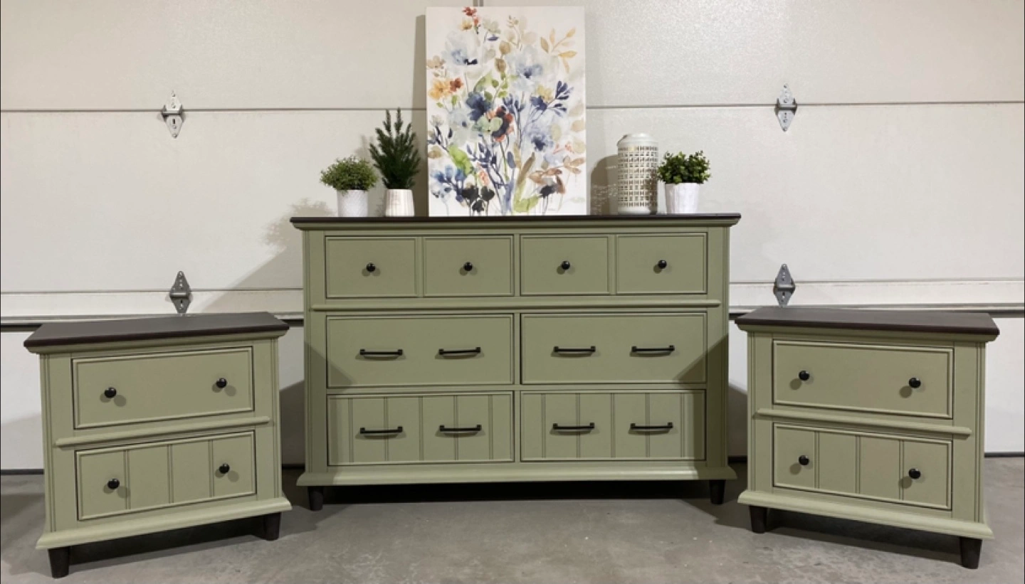 Hardwood bedroom set Includes a Long Hardwood Dresser measuring 59.5” L x 18”D x 39.5” H Featuring six dovetailed drawers with modern black metal pulls Painted in Acadia Pear with walnut stained tops and satin polyurethane top coatings Also includes Two nightstands measuring 27”W x 17”D x 27”H Each nightstand has two dovetailed drawers with modern black metal hardware Also painted in Acadia Pear with Satin topcoats Price $849 ( 3 piece set ) Pickup in Airdrie or delivery can be arranged