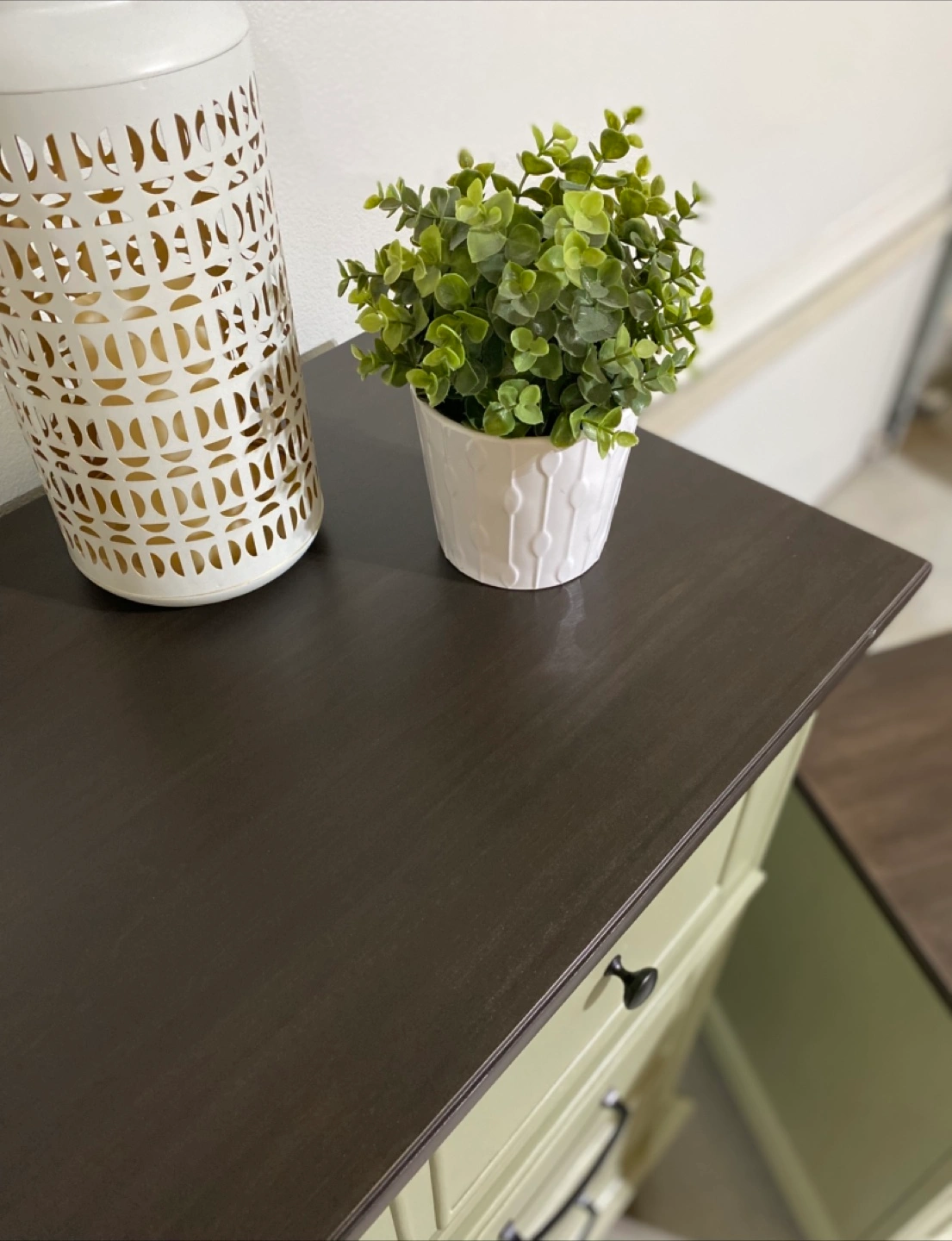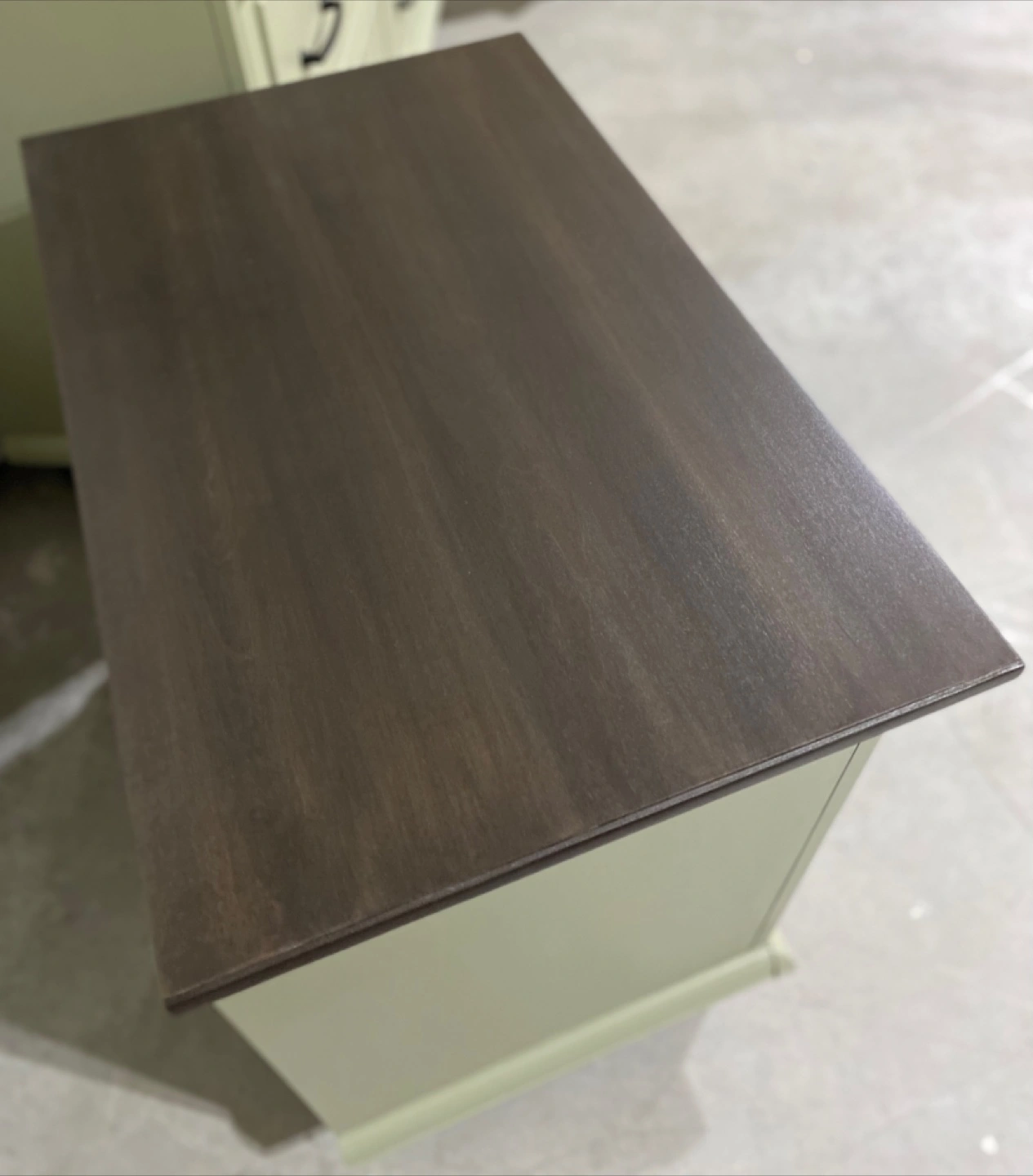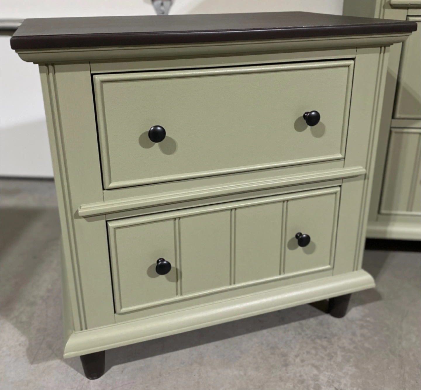 Hardwood bedroom set Includes a Long Hardwood Dresser measuring 59.5” L x 18”D x 39.5” H Featuring six dovetailed drawers with modern black metal pulls Painted in Acadia Pear with walnut stained tops and satin polyurethane top coatings Also includes Two nightstands measuring 27”W x 17”D x 27”H Each nightstand has two dovetailed drawers with modern black metal hardware Also painted in Acadia Pear with Satin topcoats Price $849 ( 3 piece set ) Pickup in Airdrie or delivery can be arranged
