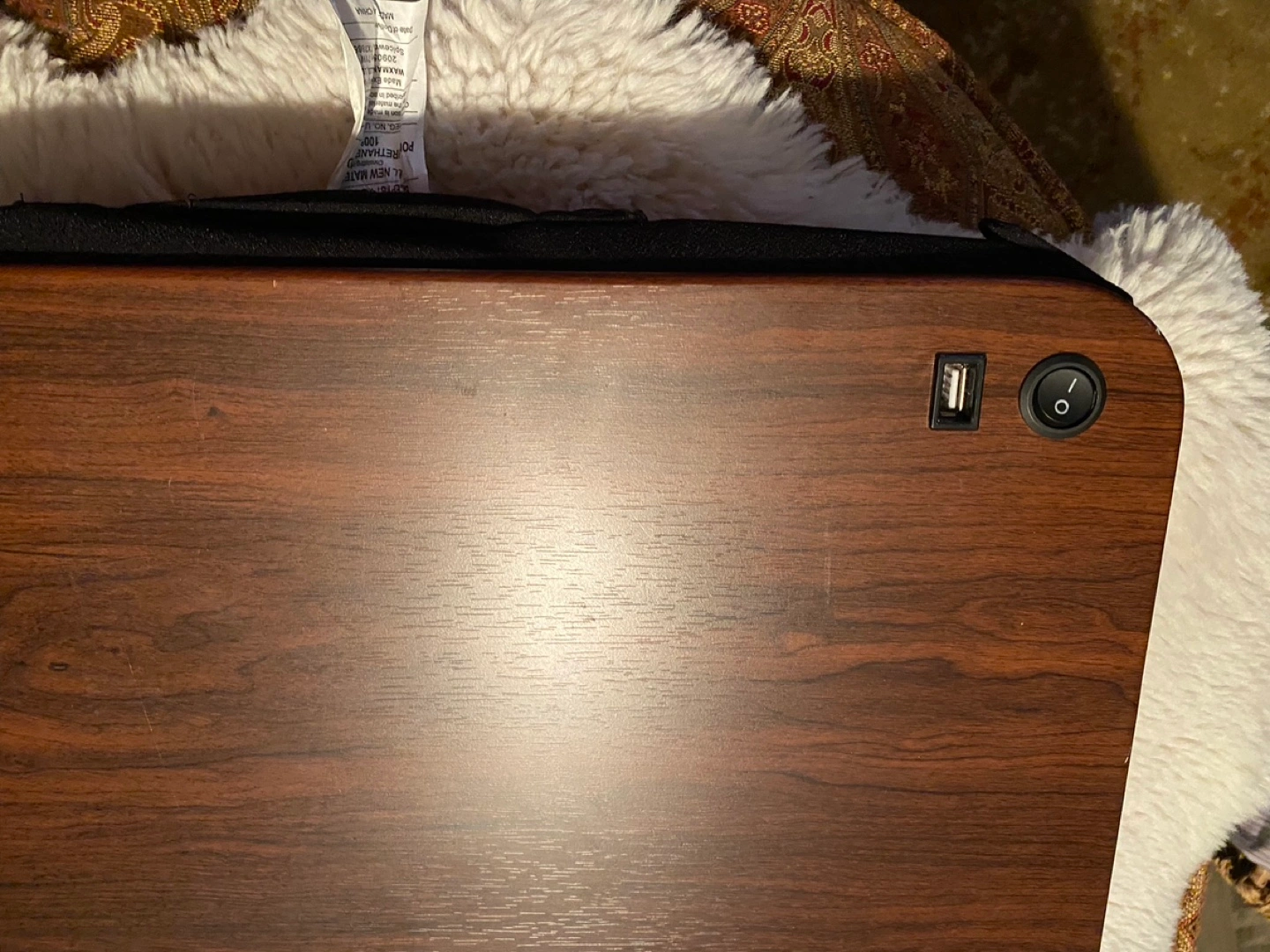 Lightly used heated lap desk. Features a cushioned mouse pad and USB port. Dark wood finish. Excellent for working from the couch.