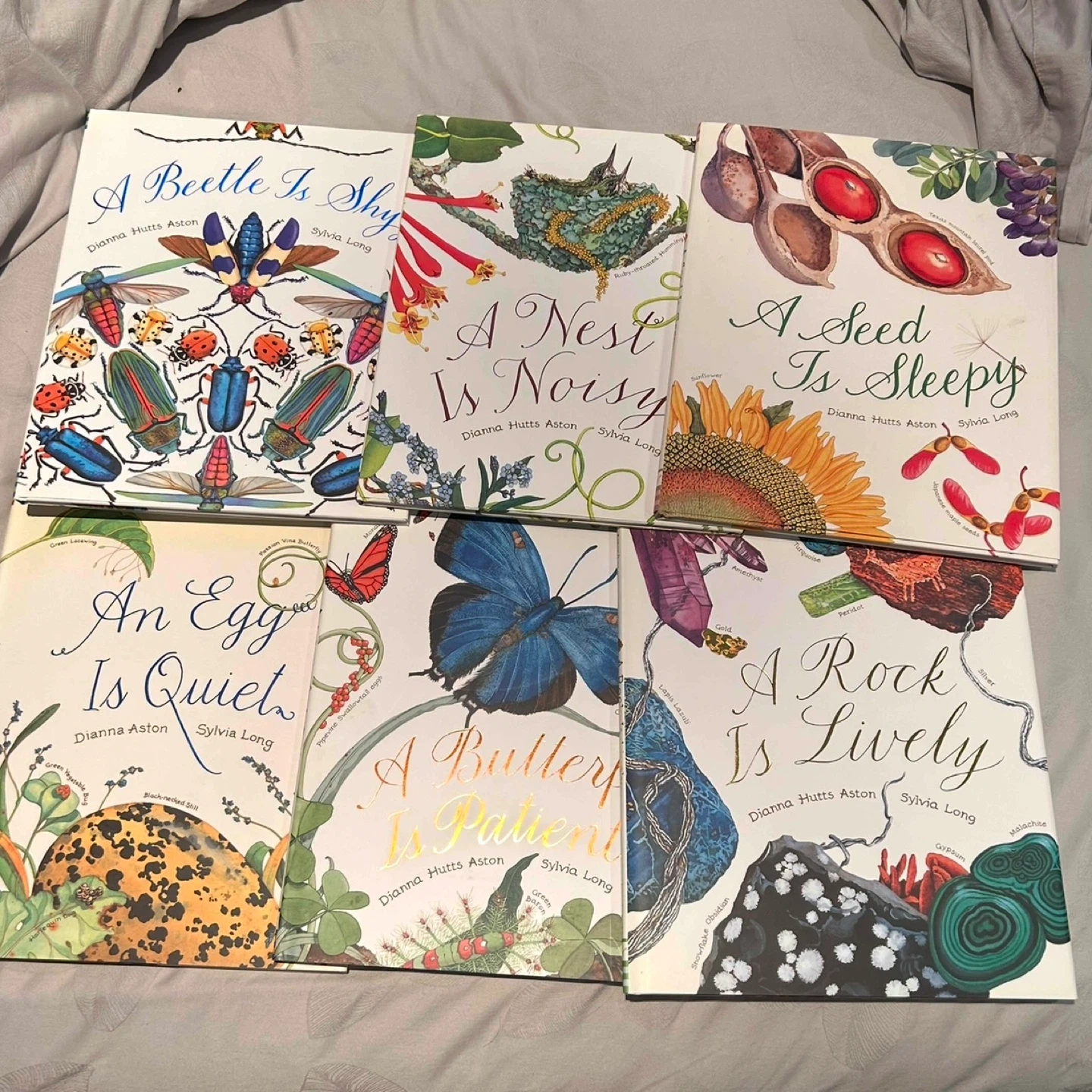 Selling a set of nature books by Dianna Hutts Aston and Sylvia Long! Titles include: A Beetle Is Shy, A Nest Is Noisy, A Seed Is Sleepy, An Egg Is Quiet, A Butterfly Is Patient, and A Rock Is Lively $20 for set