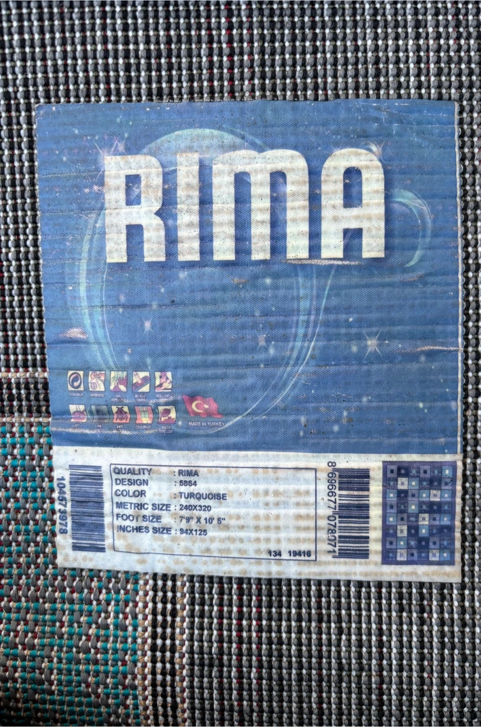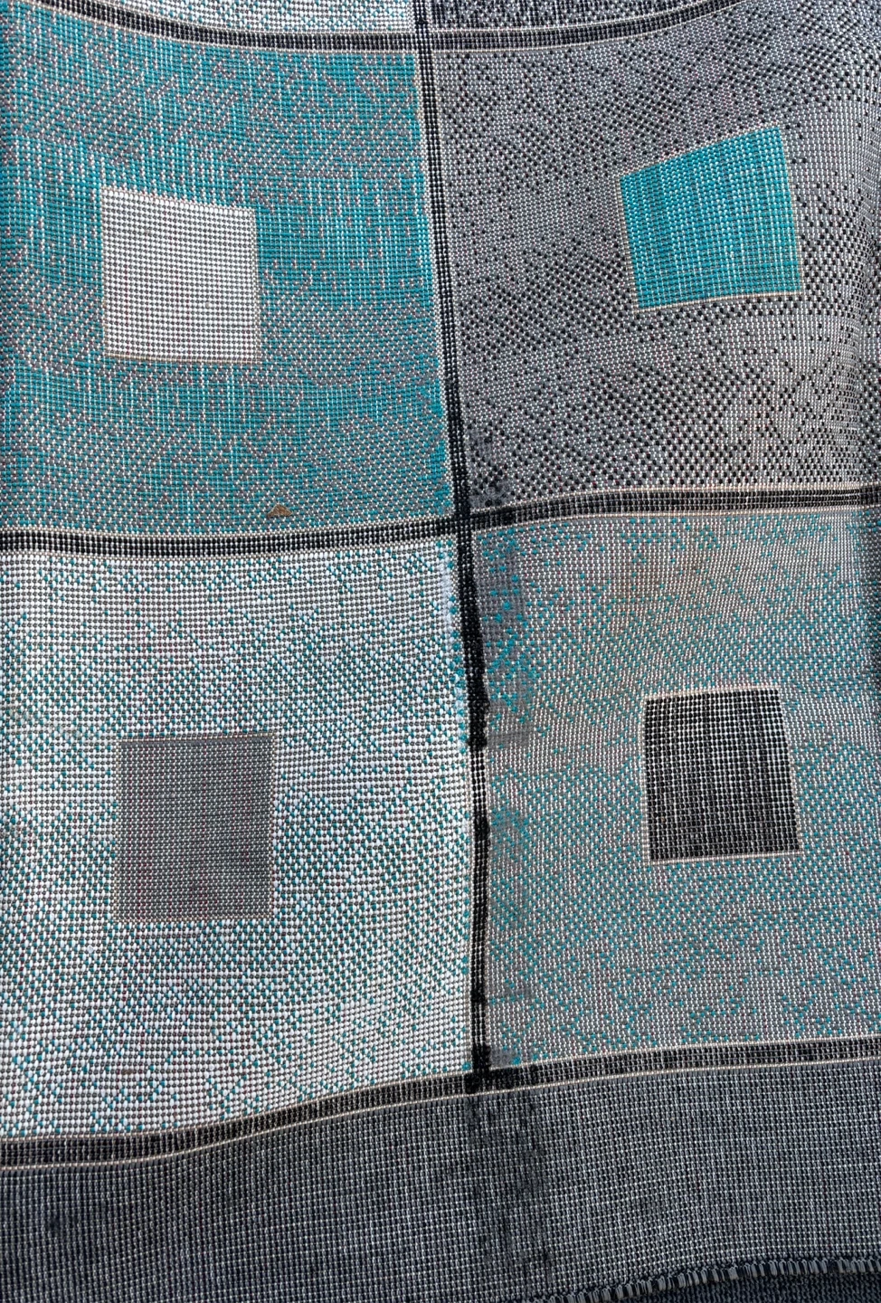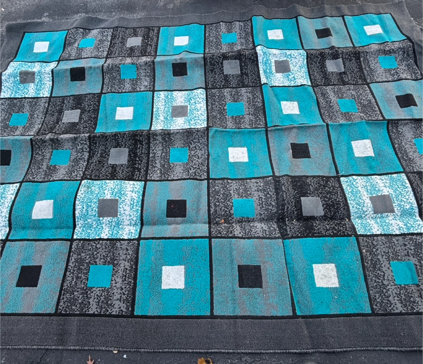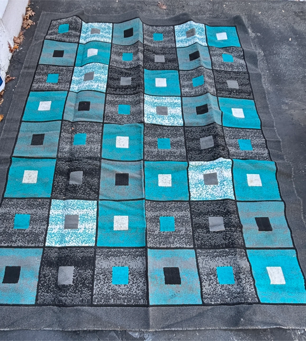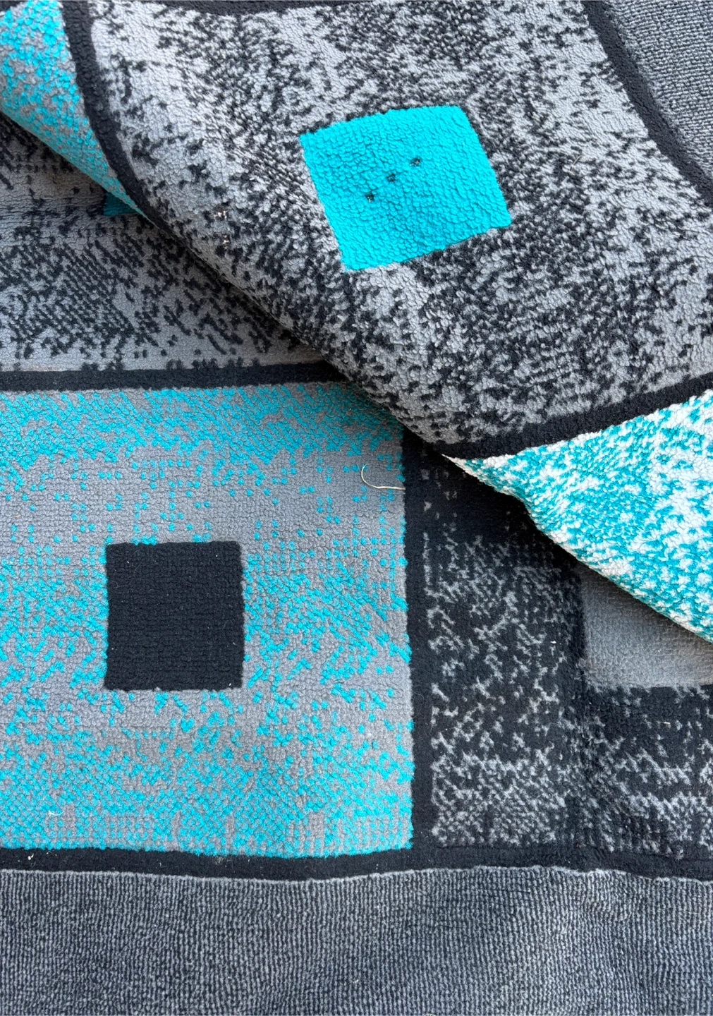 97Here's a stylish area rug with a cool geometric pattern! Made in Turkey. Dimensions roughly 8 x 10 feet. It features squares in shades of blue, grey, and black. It would look great in any room and add a touch of modern flair to your home