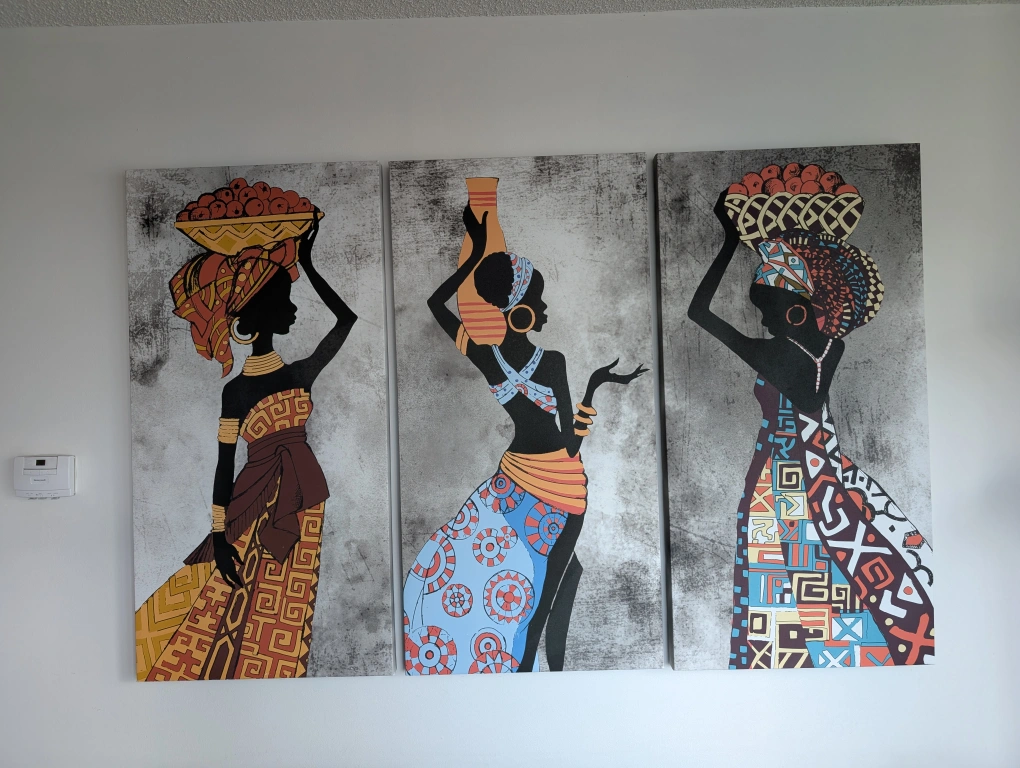 60A stunning piece of art. Three panels depicting silhouetted African women. Carrying baskets and pottery. Adds a touch of culture to any space. Such art can set the mood for relaxation. Size: 65"x42"