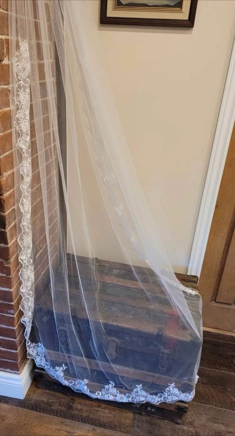 Selling a beautiful white cathedral wedding veil with delicate lace trim. This veil would be perfect for your special day! It's in great condition and ready to make someone feel like a princess. The lace detailing is really lovely and adds a touch of elegance.
