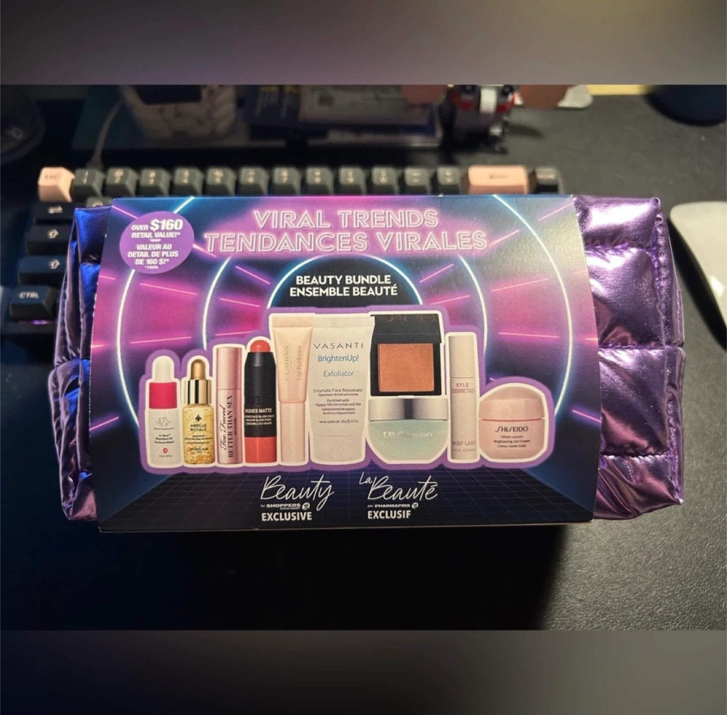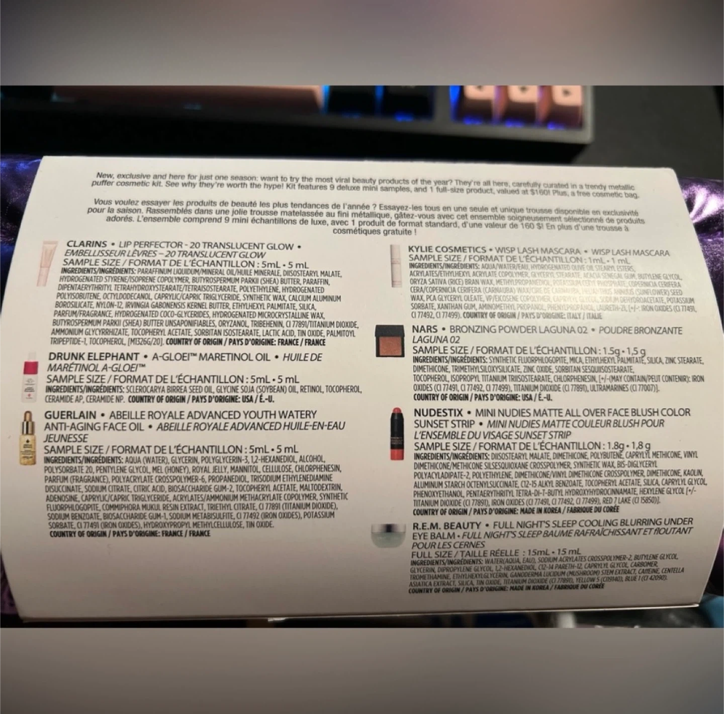 5Get your hands on this Beauty La Beaute Exclusive Viral Trends Beauty Bundle! This set includes a variety of sample-sized beauty products, all neatly packaged in a trendy metallic puffer cosmetic bag. It's a great way to try out new items or stock up on travel sizes. The bundle includes brands like Shiseido, Too Faced, Vasanti, Clarins, Kylie Cosmetics, Guerlain, Drunk Elephant, Nudestix and R.E.M. Beauty