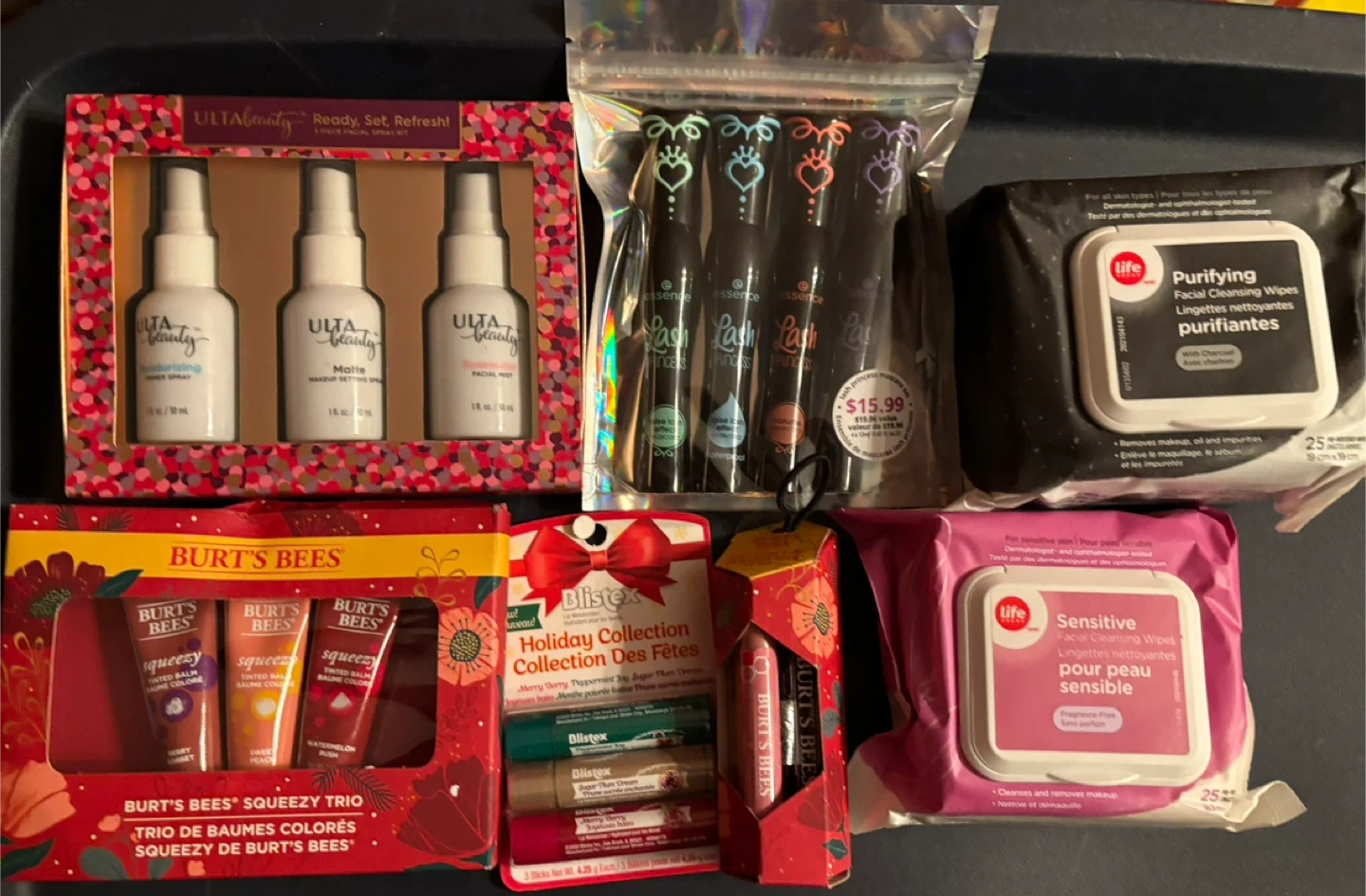 5Selling a collection of beauty gift sets! Includes: - ULTA Beauty Ready, Set, Refresh! 3-piece facial spray kit - Essence Lash Princess Mascaras (set of 4) - originally $15.99 - Burt's Bees Squeezy Trio tinted balm set - Blistex Holiday Collection lip balms - Life Brand Purifying and Sensitive facial cleansing wipes (25 wipes each) All brand new never opened