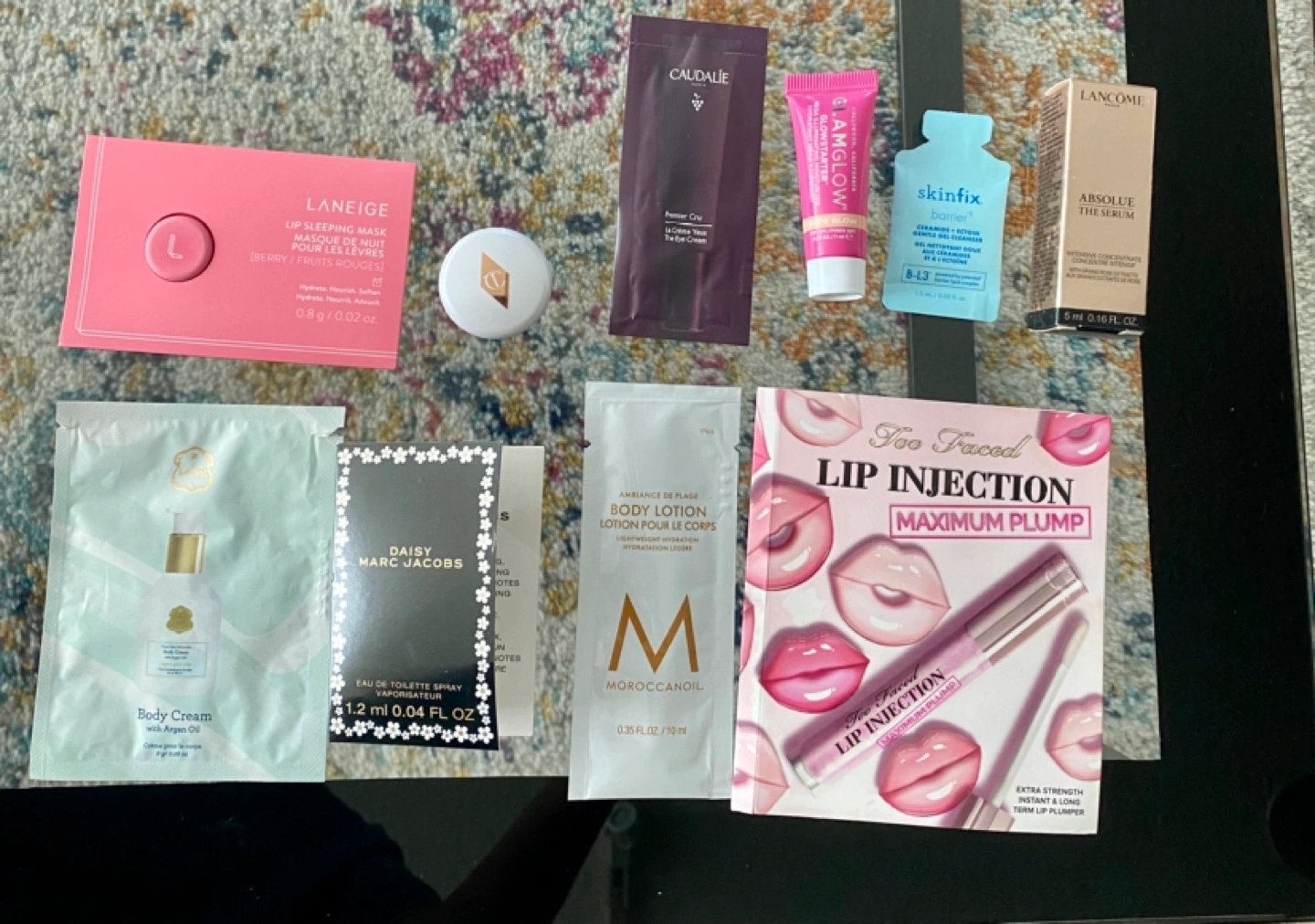 Take all for $5 Variety of beauty samples. Includes Laneige lip sleeping mask, Glamglow moisturizer, Too Faced lip injection, Caudalie eye cream, Marc Jacobs Daisy perfume, Moroccanoil body lotion, and more. Perfect for travel or trying new products.