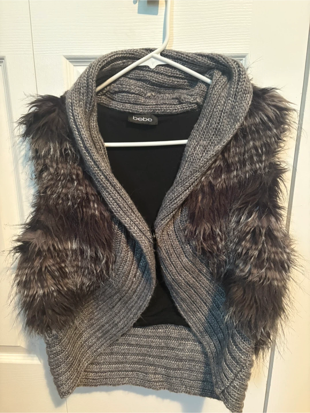 Cozy up with this stylish Bebe vest! It features a soft knit body and faux fur accents, perfect for adding a touch of warmth and texture to any outfit