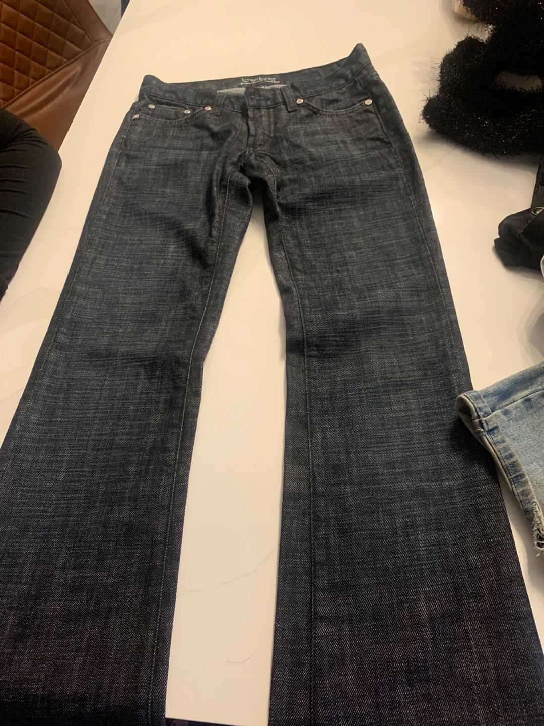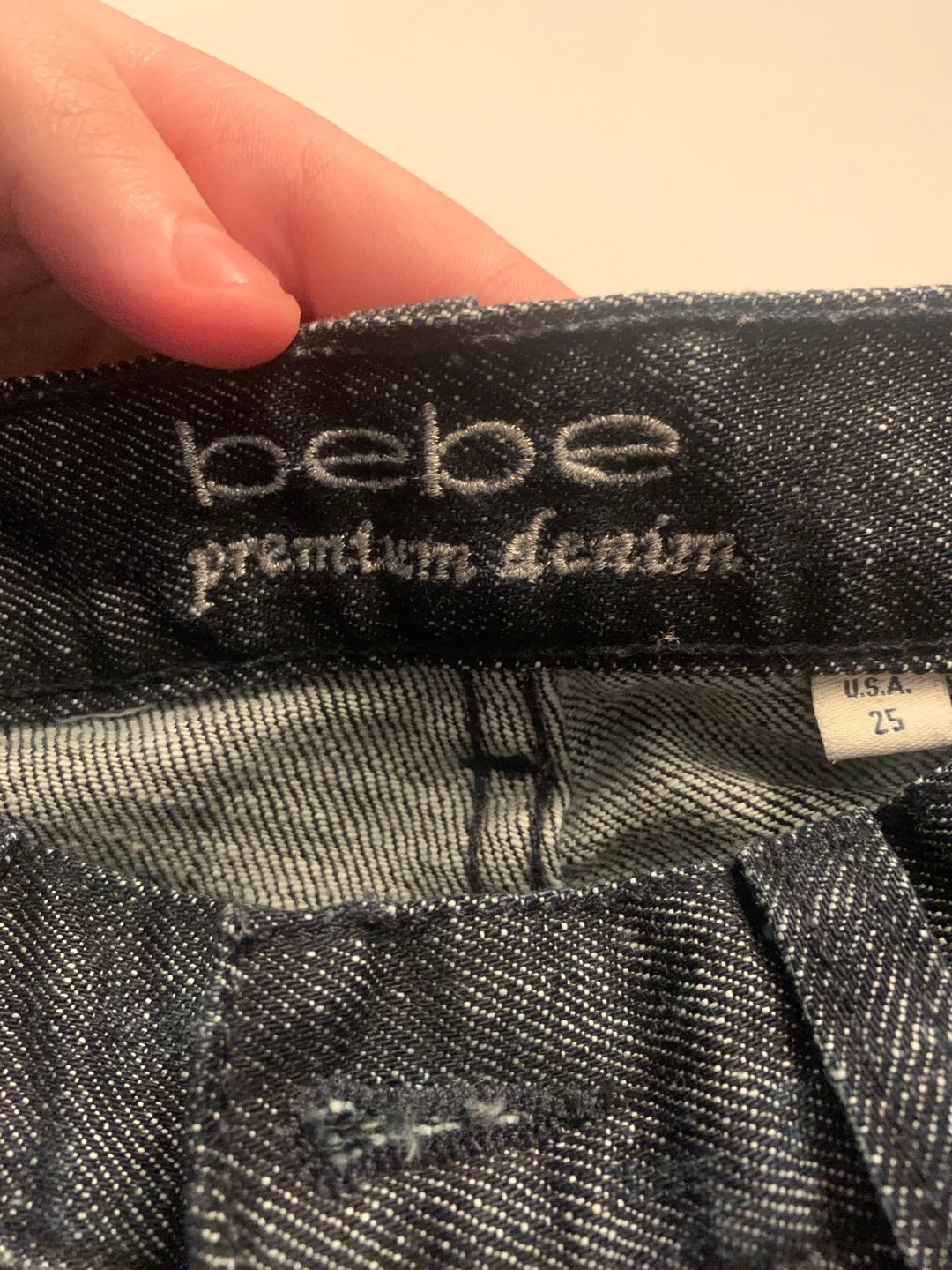 25Selling a pair of Bebe premium denim jeans. They're a size 25 and feature a dark wash. The back pockets have a unique design. Great for adding a bit of sparkle to your outfit!