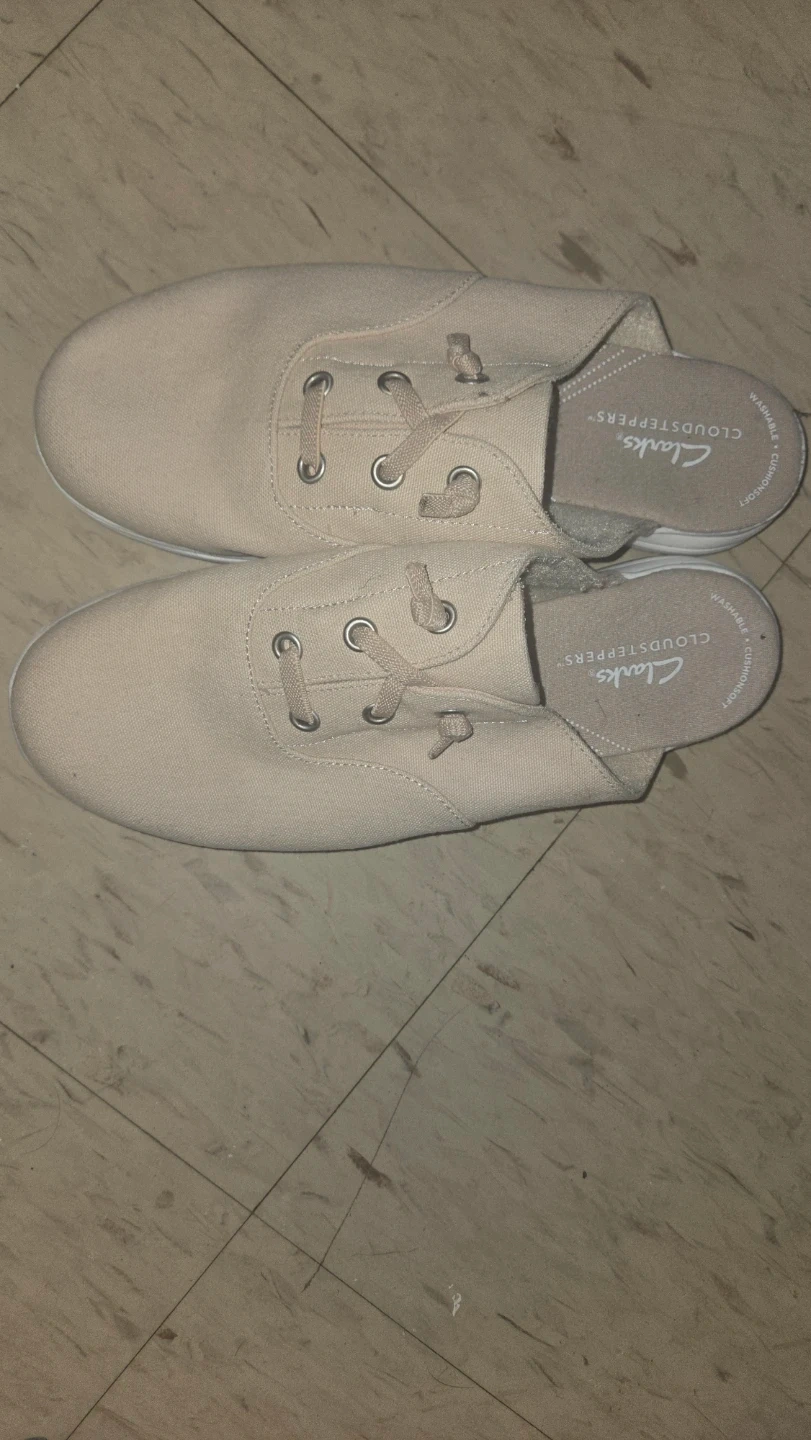 These Clarks Cloudsteppers mules are a light tan colour. They feature a slip-on design with decorative laces. The soles offer comfortable cushioning don't fit me